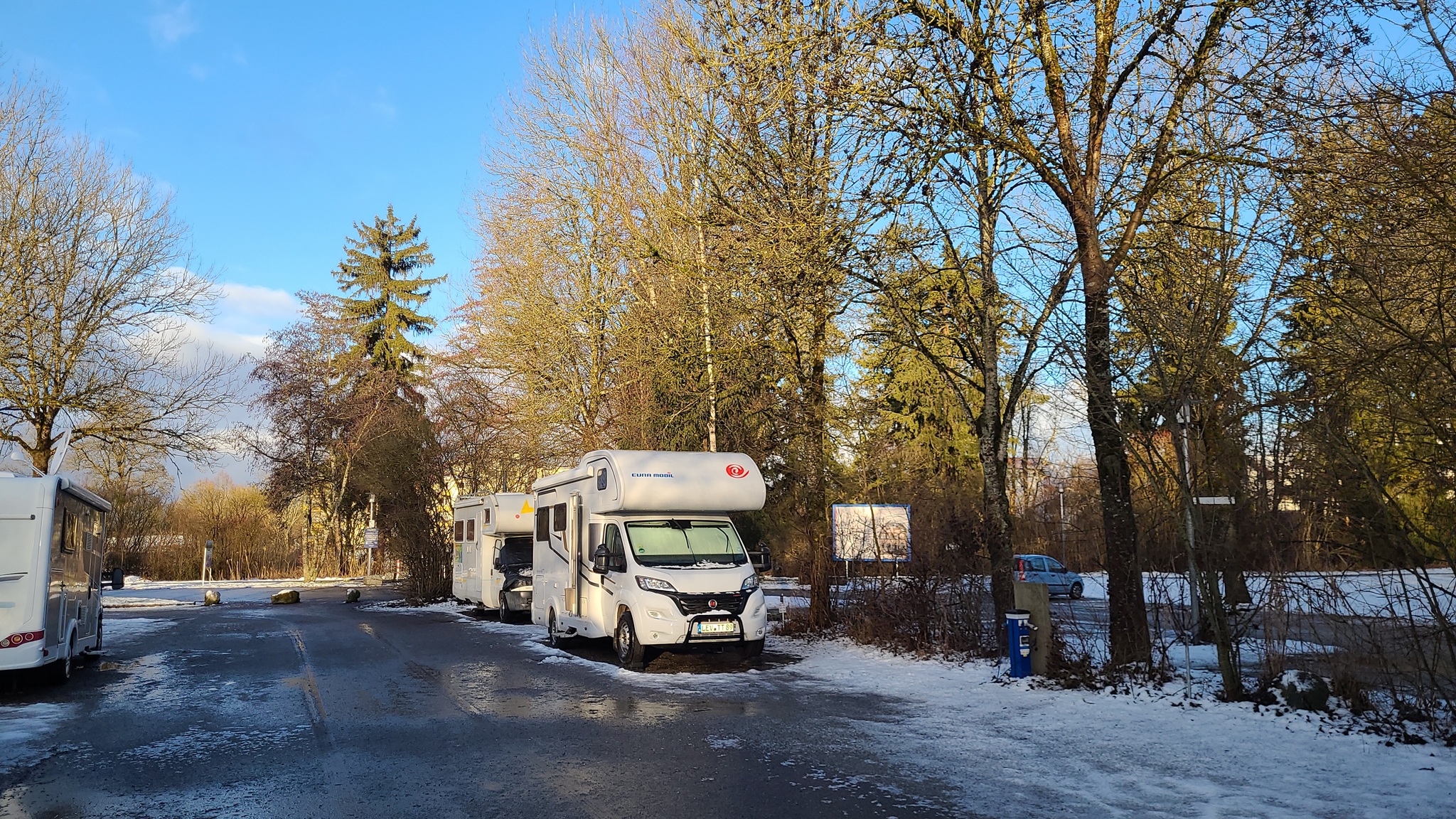 Für die 450 Kilometer sind wir acht Stunden unterwegs und treffen erst zur Sonnenuntergangszeit in Bad Dürrheim ein. Aber immerhin, wenigstens noch mit Tageslicht, wodurch mir das unangenehme Rangieren im Dunklen erspart bleibt.