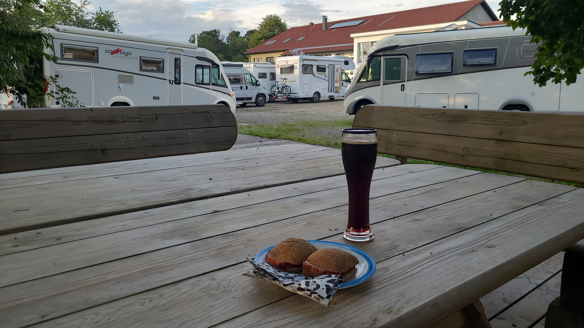 Ich finde ein Plätzchen zwischen den anderen Fahrzeugen und lasse den Tag nur noch gemütlich ausklingen. Da die Werkstatt mitten im Grünen liegt, kommt tatsächlich so etwas wie Entspannung auf. In einer schönen schattigen Ecke gibt es sogar eine Sitzgruppe mit schweren Holzmöbeln, wie man sie von Rastplätzen kennt. Perfekt für mein Abendessen aus Aufbackbrötchen und etwas Leberkäse.