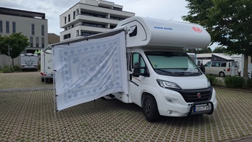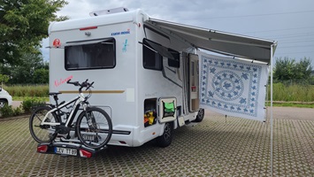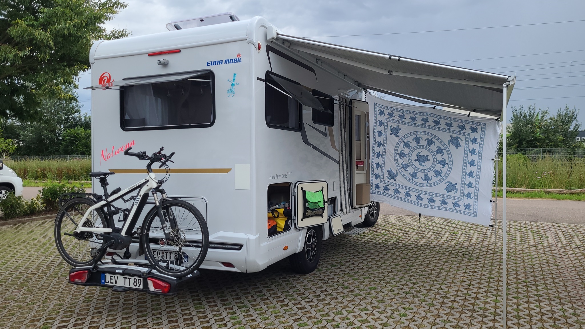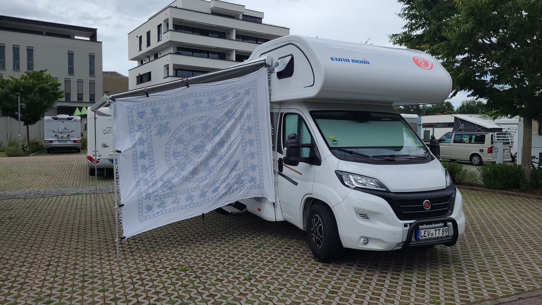 Später probiere ich dann mal die neuen Zusatzstangen an der Markise aus. Tina möchte da große Strandtücher als Sonnenschutz aufhängen. Die Tücher hatten wir schon bei Emil mit, da Tina sie auf Sardinien auf dem Markt von Alghero gekauft hatte.