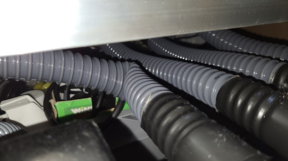 Aber gemeinsam gelingt die Aktion. Diesmal wird nicht nur ein gebogener Schlauch eingesetzt, sondern es kommt auch noch ein festes 45-Grad Winkelstück dazwischen, so dass der Schlauch jetzt in günstigem Winkel geführt wird. Nach wie vor bin ich der Meinung, dass man das eigentlich schon bei der Montage im Werk so hätte lösen müssen.