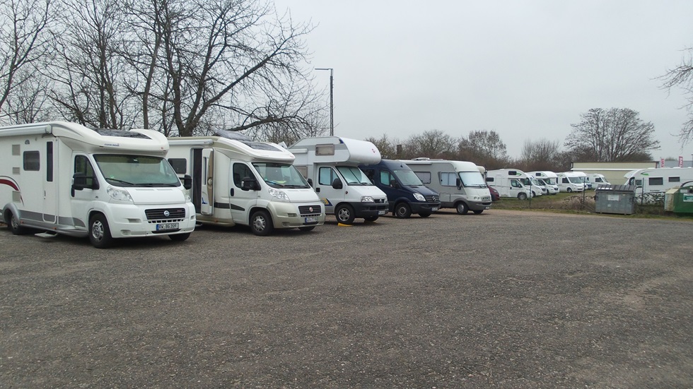 Auf dem Stellplatz sind wir überrascht, wie voll es um die frühe Uhrzeit schon ist. Zwei Stunden später sind am hellen Nachmittag bereits alle Plätze belegt und Neuankömmlinge müssen woanders hinfahren oder auf eine Notfläche an einer Skaterbahn. Beides sicher nicht so toll.