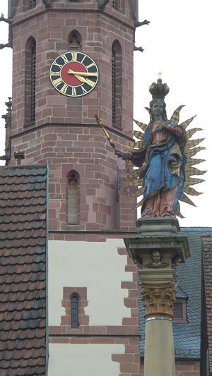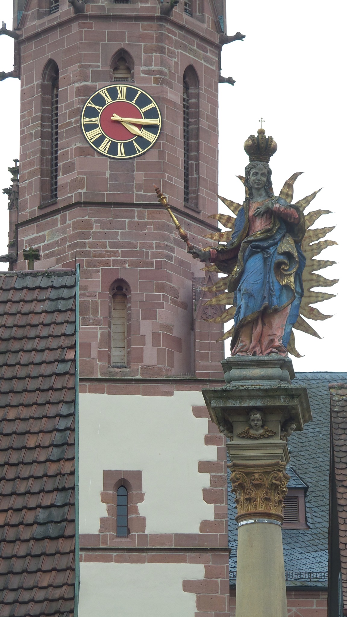 Auf dem Marktplatz können wir an einem Stand mit frischem Spargel nicht vorbei gehen, ohne uns für das Mittagessen einzudecken. Bei dieser Gelegenheit bewundern wir auch das alte Rathaus am Marktplatz, dessen Turm auf der einen Seite Rathausturm ist, während sich auf der anderen Seite eine Kirche anschließt, die den Turm ebenfalls nutzt und zwar als Kirchturm.