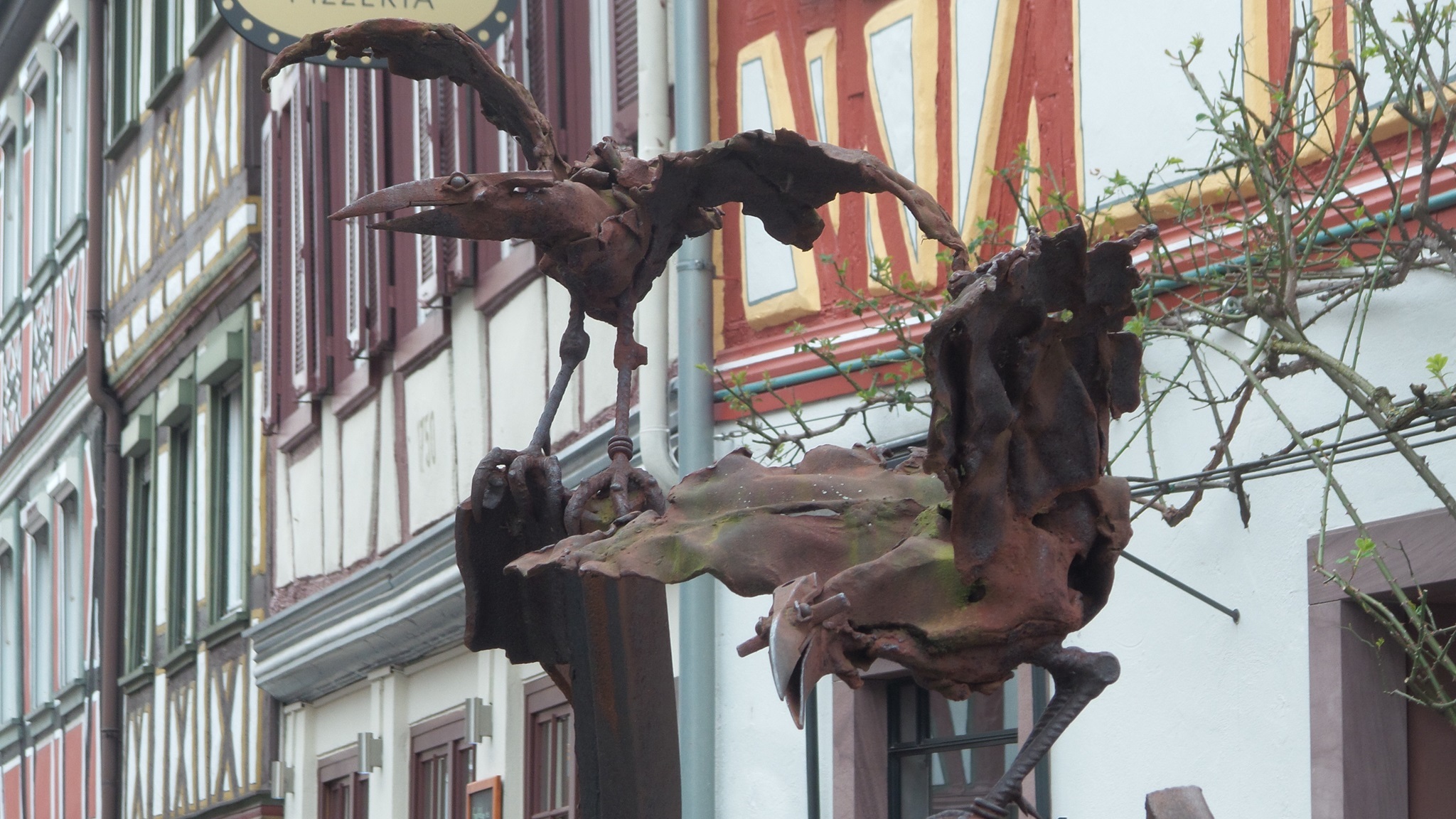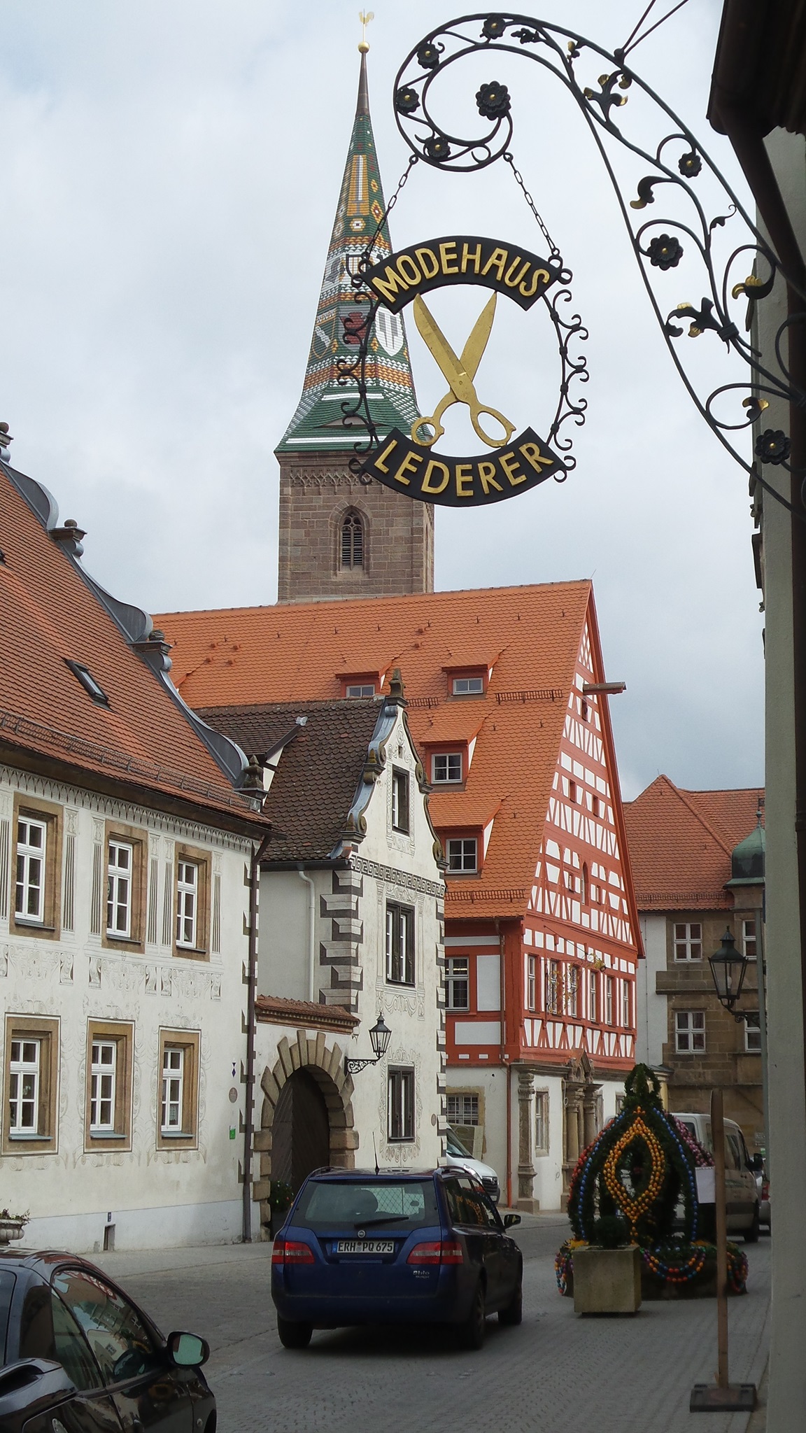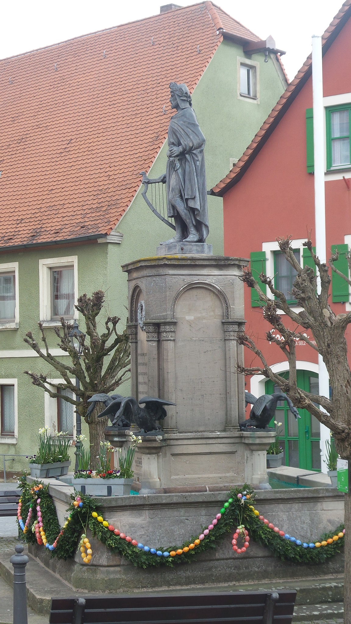 Die Stadt selber ist auch wieder sehr schön. Praktisch jedes Haus hat hier eine Geschichte, die auf kleinen Tafeln an der Fassade auch erwähnt wird. Auf dem kleinen Platz vor dem Haus des ehemaligen Deutschritterordens steht das Denkmal von Wolfram von Eschenbach, dem Dichter des „Parzival“. Auch wenn wir dieses Werk nie gelesen haben, schon alleine weil uns die Sprache viel zu anstrengend ist, haben wir natürlich trotzdem schon von diesem Werk gehört.