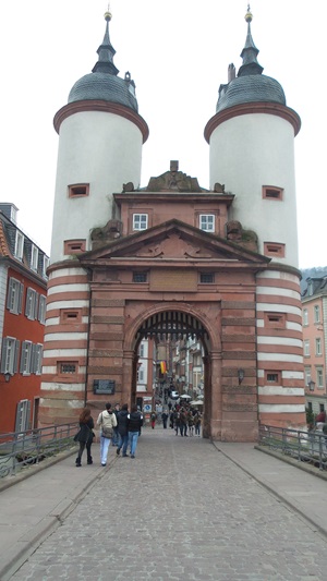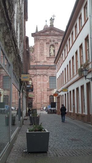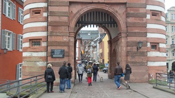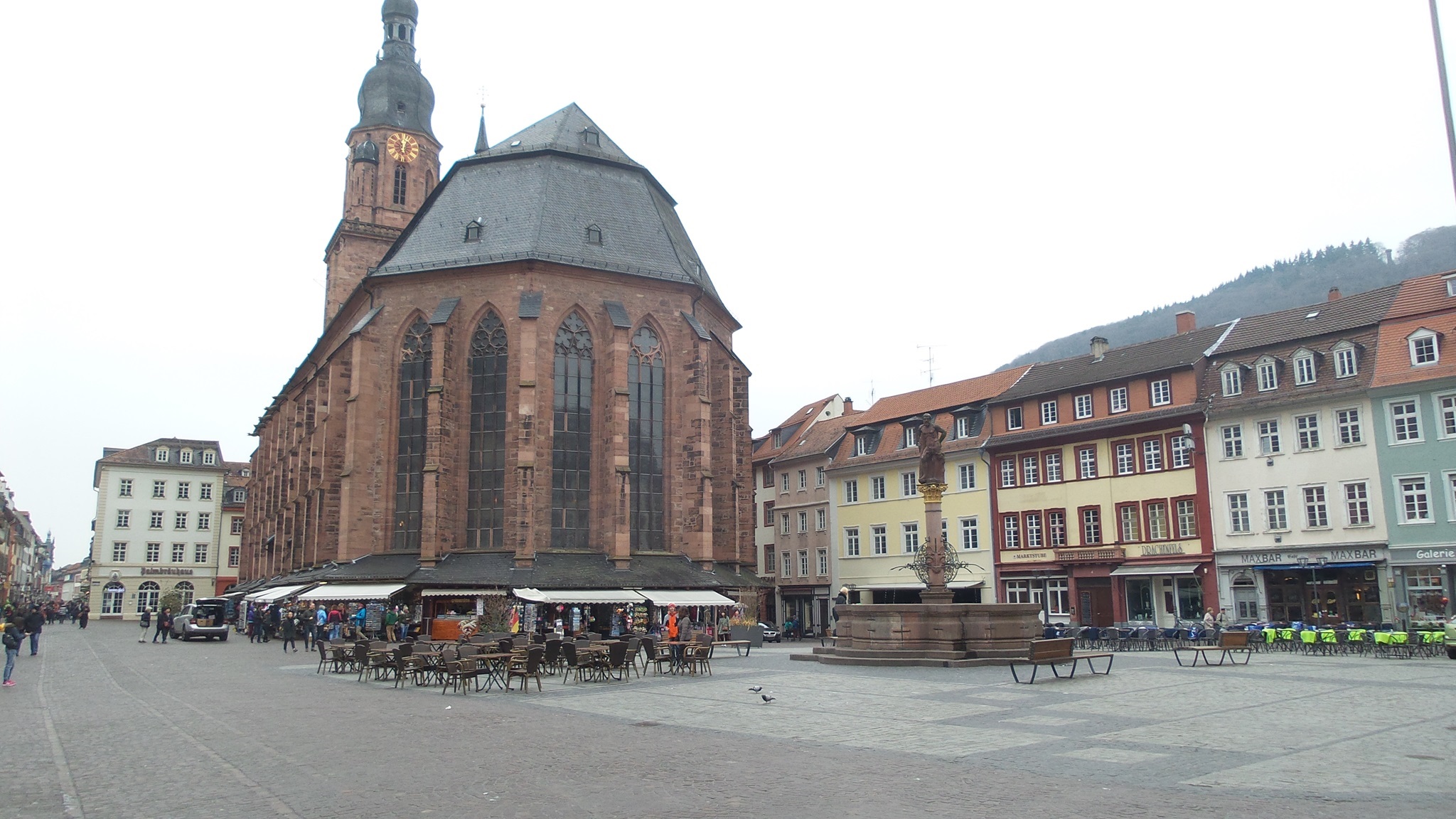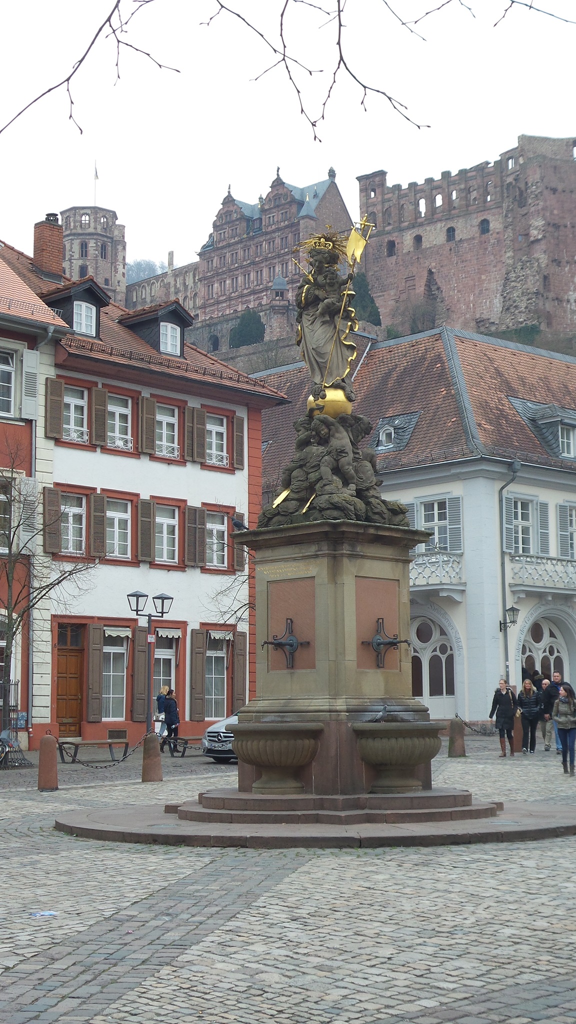 Leider ist es auch heute wieder sehr diesig mit einer bleigrauen Wolkendecke, die kein Fitzelchen Sonne durchlässt. Daher wirkt alle eher trist in Grau- und Brauntönen. Das Schloss zum Beispiel, das auf Werbefotos von Heidelberg immer so schön von der tiefstehenden Sonne angeleuchtet wird, ist gegen den braunen Hang im Hintergrund kaum zu erkennen.