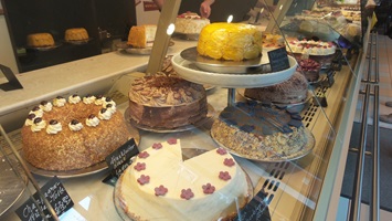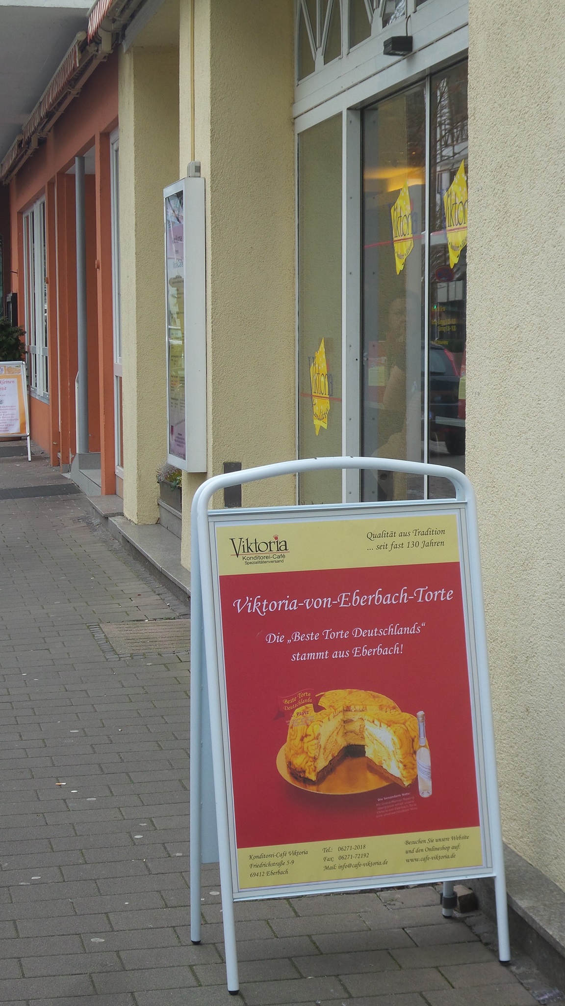 Erst in Eberbach halten wir an und machen noch einen Rundgang durch die Altstadt. In einer Konditorei gibt es die „weltbekannte“ Viktoria-Torte. Die kaufen wir wegen des darin vermutlich enthaltenen Alkohols aber nicht, sondern entscheiden uns für zwei leckere Stücke Käse-Sahne, die wir später in aller Ruhe bei einer Tasse Kaffee im Wohnmobil vertilgen.