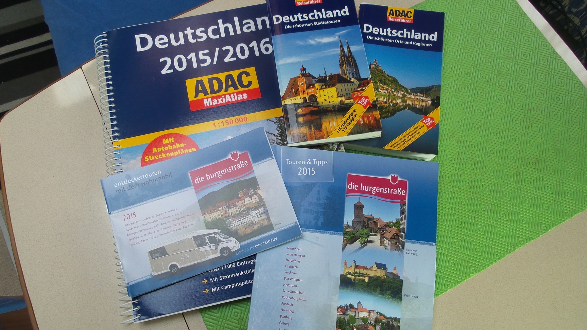 Übrigens haben wir für unsere Fahrt auch wieder etwas Literatur dabei. Als erstes sind da natürlich unsere Standardwerke zu nennen: Der große ADAC Maxi-Atlas und die beiden Deutschland-Reiseführer „Städtetouren“ und „Regionen“, die wir immer im Gepäck haben und mit denen wir auch spontane Reisen unternehmen können und zumindest immer eine grobe Orientierung über unsere Reiseziele erhalten.