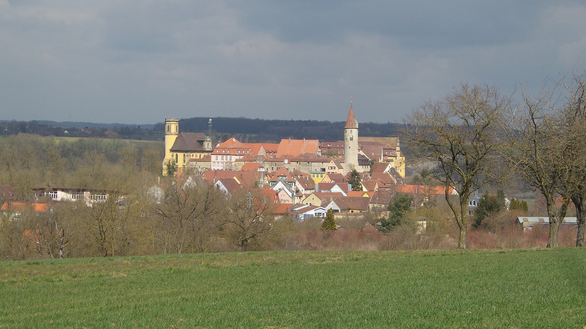 Erst am Mittag sind wir dann wieder am Mobil und setzen unsere Fahrt fort. Über Kirchberg fahren wir heute noch nach Rothenburg o. d. Tauber. Dabei kommt heute endlich immer wieder die Sonne durch die Wolken. Damit gehen dann auch endlich mal ein paar schöne Fotos, wie z. B. das von Kirchberg a. d. Jagst, das sich uns bei der Anfahrt bei einem Blick über die Hügel darbietet.
