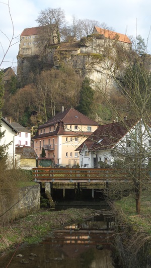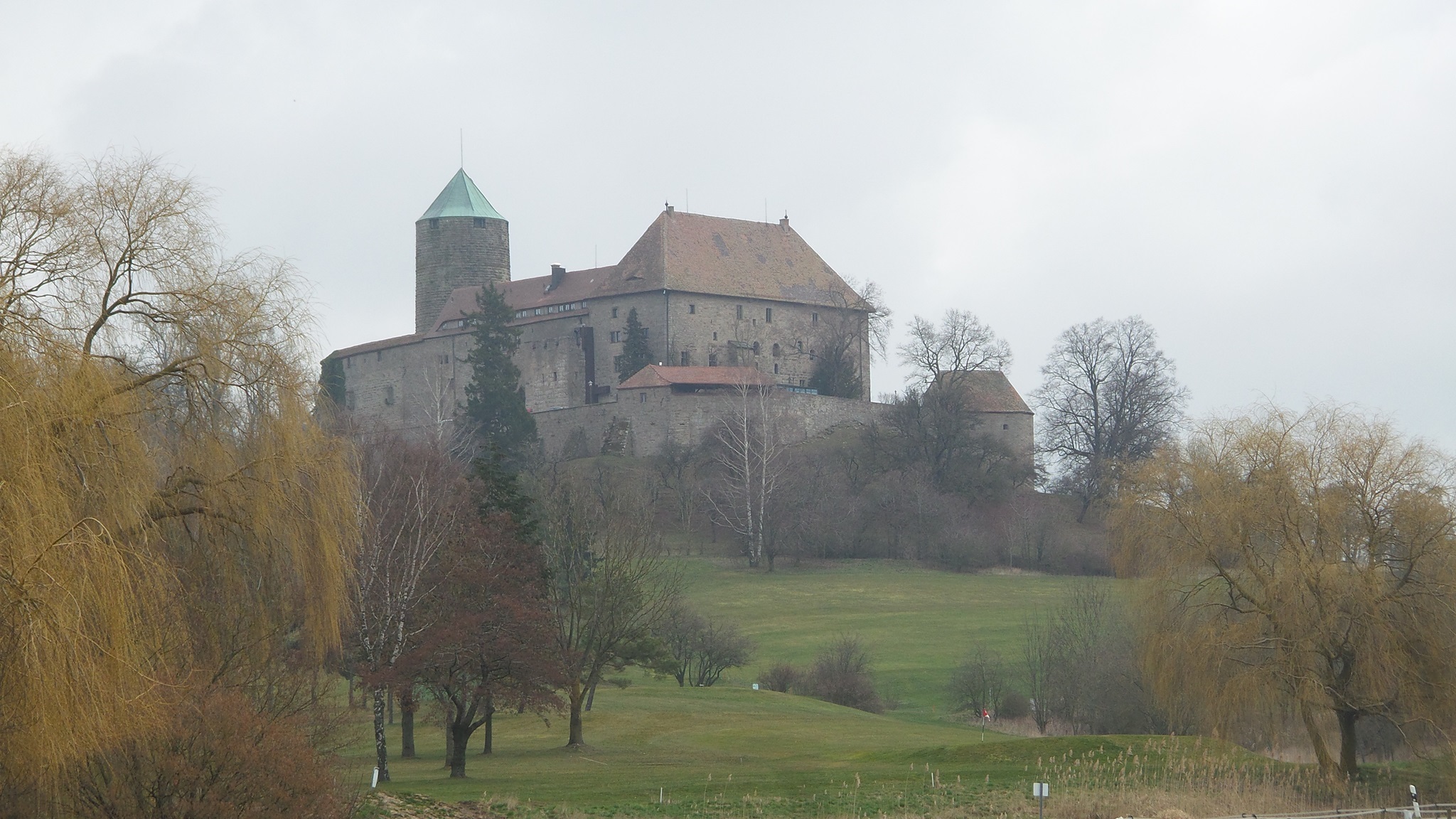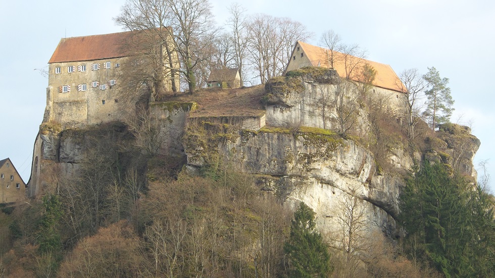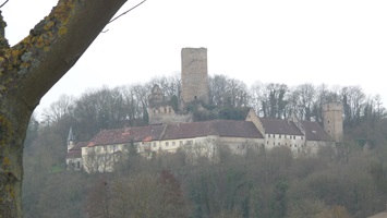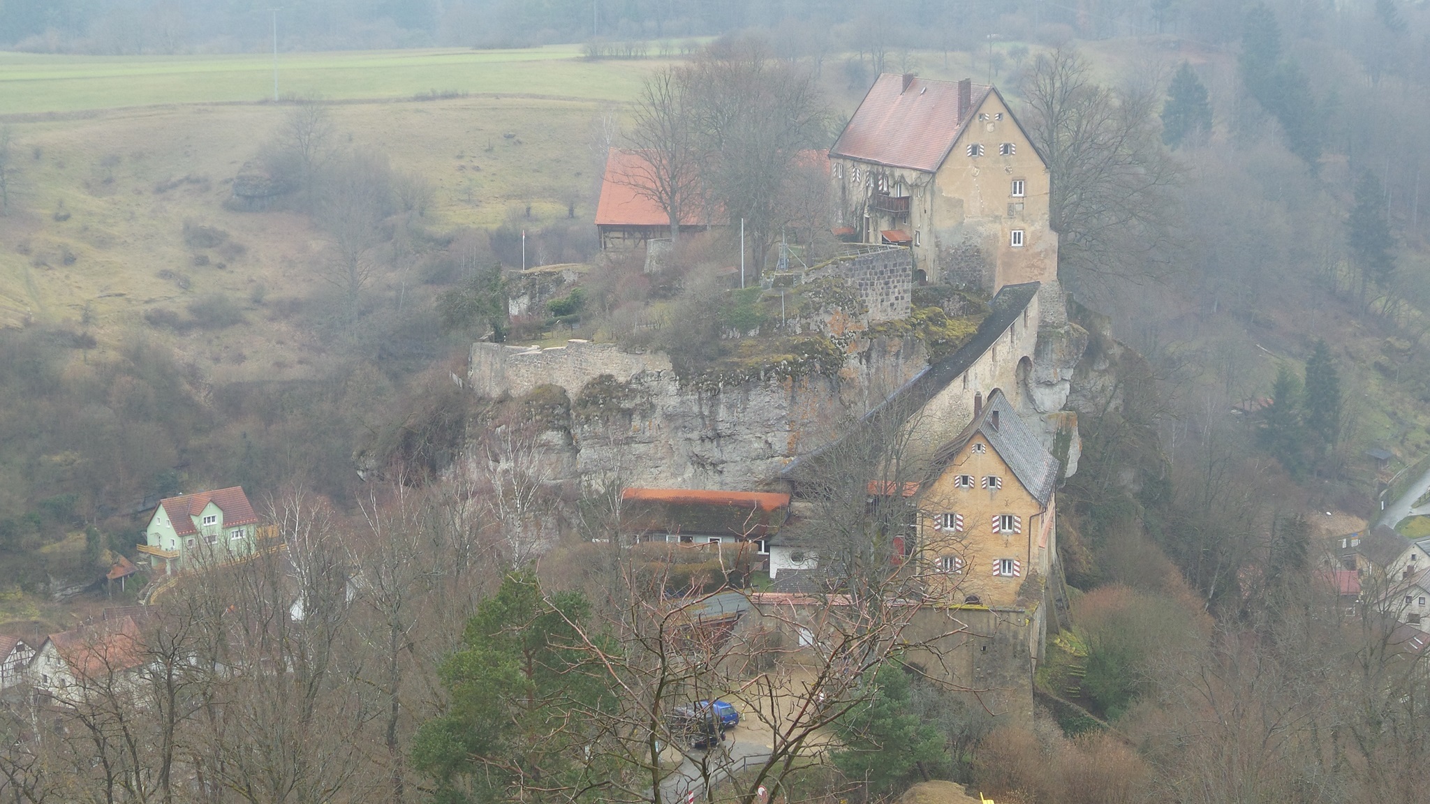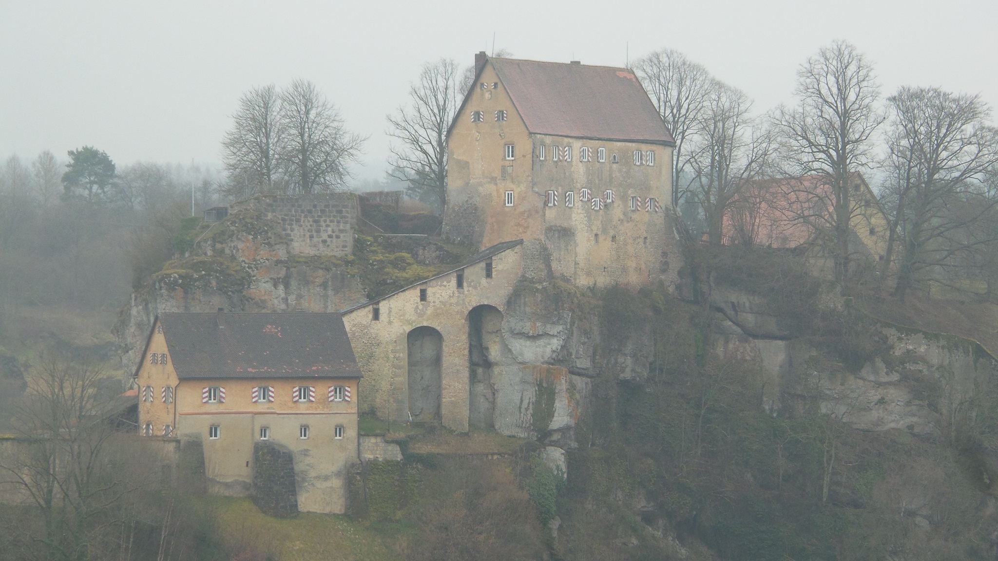Als erstes kommen wir an der Burg von Colmberg vorbei. Es ist wie an den ersten Tagen, heute ist der Himmel wieder bedeckt und die Sonne lässt sich fast gar nicht blicken. Daher gibt es heute wieder graue Burg vor grauem Fels und grauem Himmel.