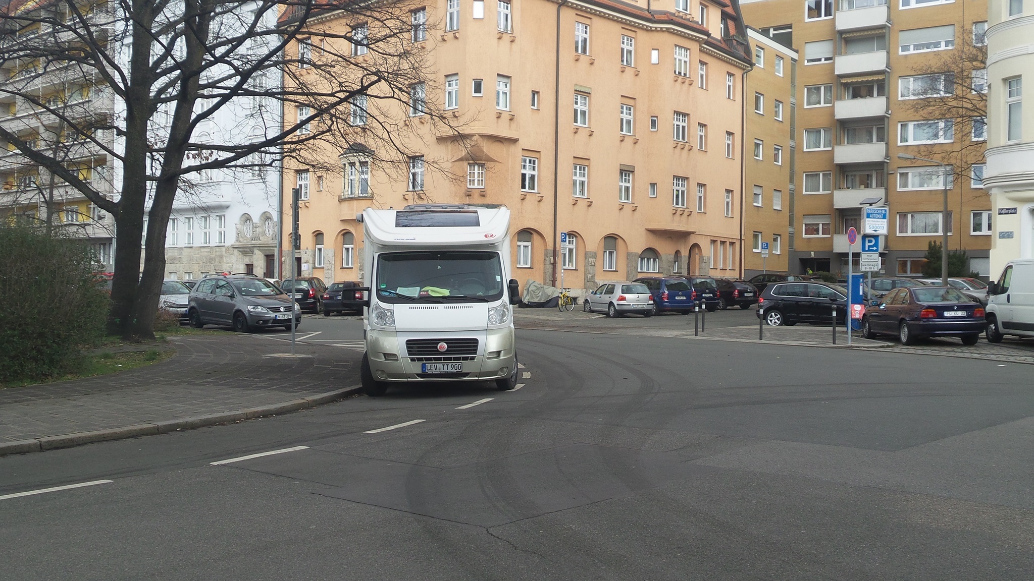 Letztlich dauert es dann aber doch noch ganz schön lange, bis wir unser Frühstück erhalten. Zunächst fahren wir nämlich nach Nürnberg rein und müssen etwas suchen, bis wir einen Wohnmobil tauglichen Parkplatz gefunden haben. Merkwürdigerweise würden hier sogar drei Wohnmobile gleichzeitig auf den Parkstreifen passen, ohne dass einer der Parkplatz suchenden Pkw-Fahrer davon Notiz nimmt.