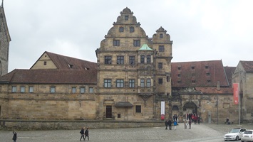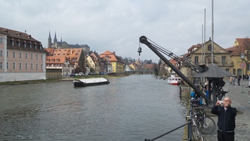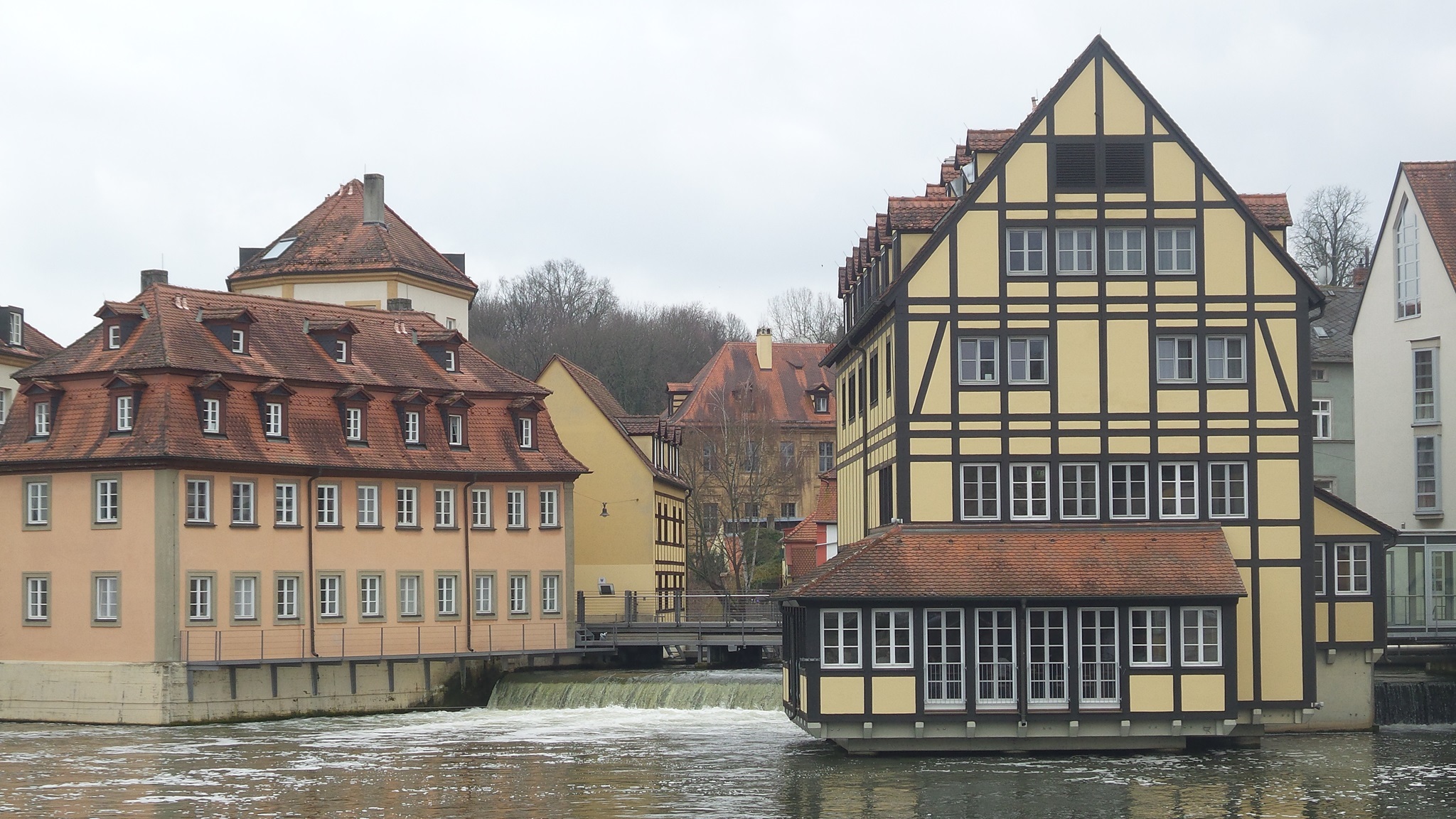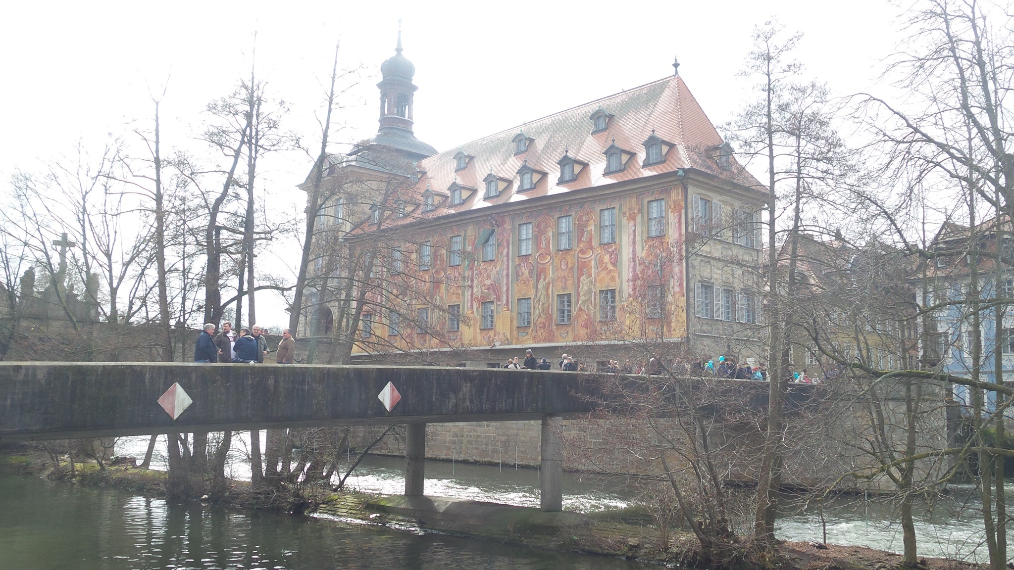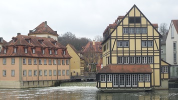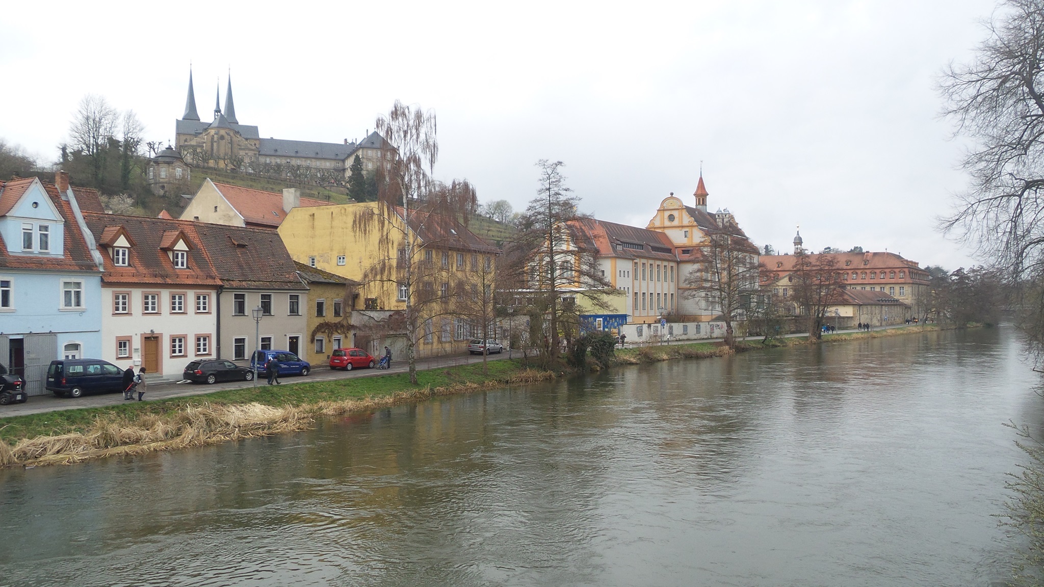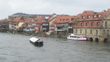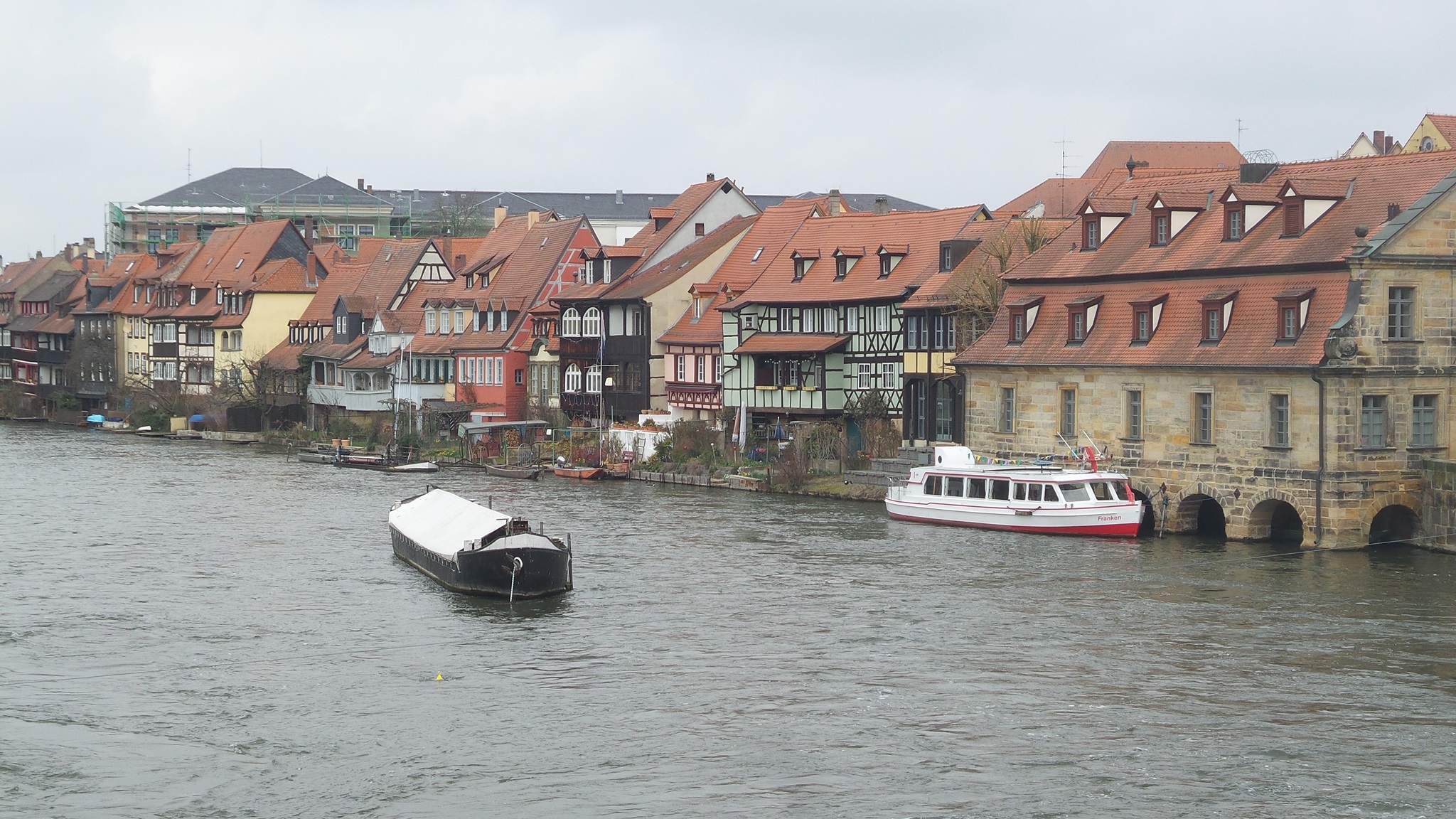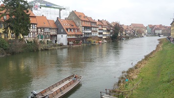 Wir fahren bis zum zentralen Busbahnhof und beginnen dort in der Fußgängerzone mit der Erkundung Bambergs. An der Regnitz schauen wir uns die Häuserzeile „Klein-Venedig“ an. Es handelt sich um ehemalige Fischerhäuser, die direkt an den Fluss gebaut sind. Noch heute hat jedes Haus einen eigenen Anlegesteg.