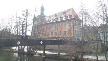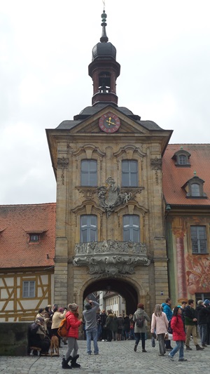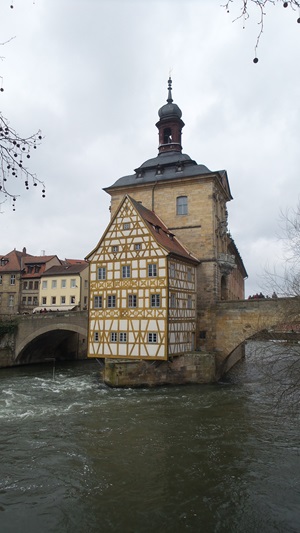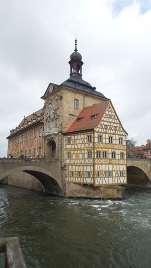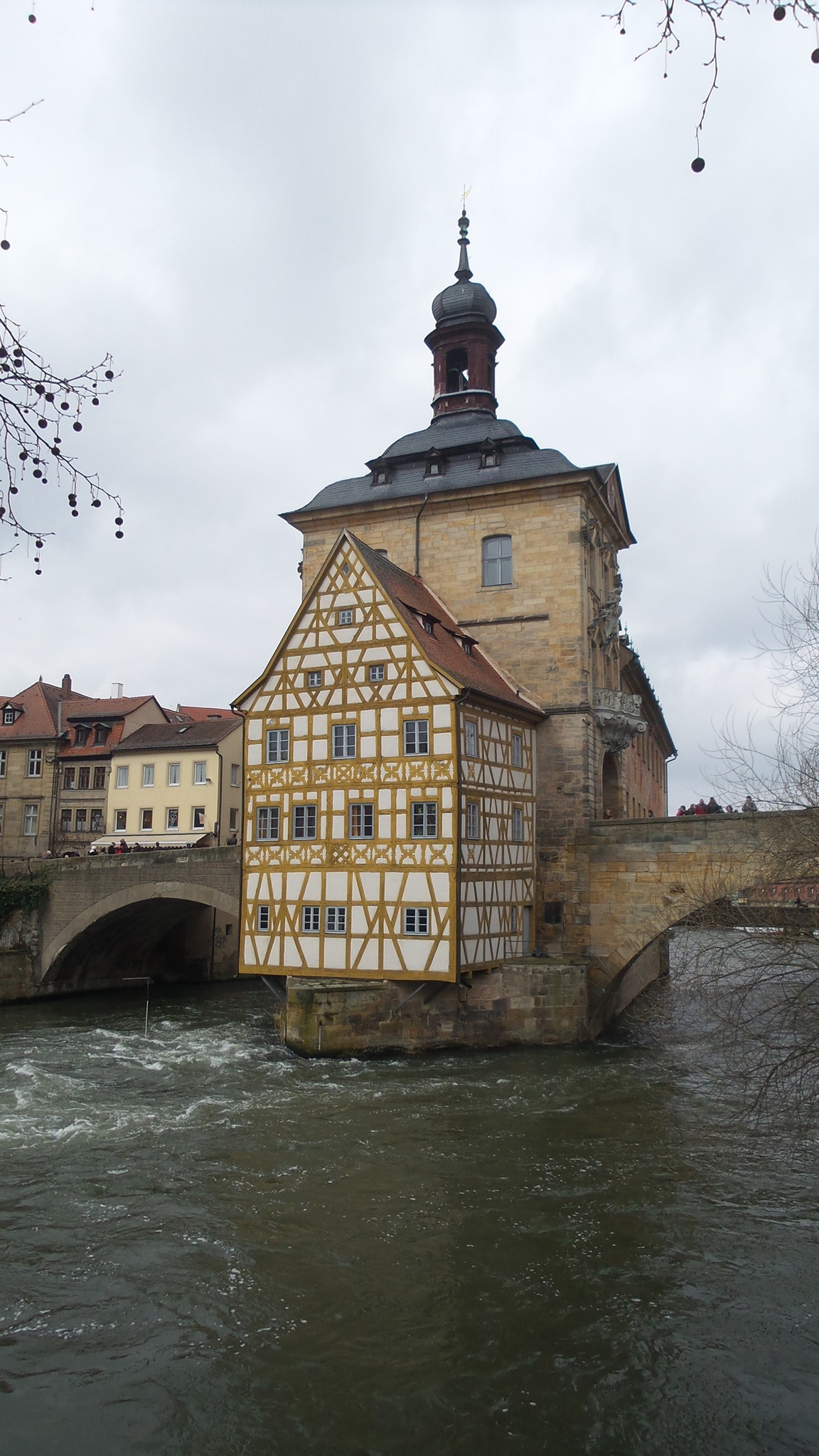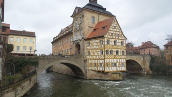Danach kommt man fast automatisch zum alten Rathaus. Es gibt einen Fachwerkanbau, der sozusagen über dem Fluss schwebt. Von drei Brücken aus hat man unterschiedliche Blicke auf das alte Rathaus, das auch noch von außen sehr schön verziert ist.