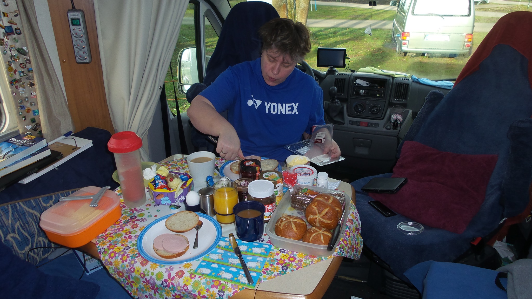 Heute geht es nur noch nach Hause. Trotz der Zeitumstellung stehen wir pünktlich auf und sitzen bald schon am Oster-Frühstückstisch. In der Camping-Rezeption gibt es auch an so einem Feiertag frische Brötchen, wenn man so wie wir am Vortag eine entsprechende Bestellung aufgegeben hat.