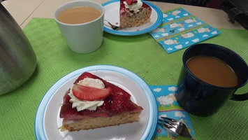 Nach dem schönen Spaziergang, bei dem wir uns in einer Bäckerei auch mit zwei Stücken Erdbeerkuchen versorgen, fahren wir schließlich weiter nach Heilbronn zu besagtem Campinghändler. Die Gasflasche ist schnell getauscht und wir sind wieder startklar.