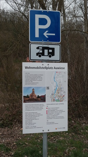 Wir steuern einen Campinghändler in Heilbronn an, um die leere Gasflasche zu tauschen. Auf dem Weg dorthin kommen wir wieder durch Bad Wimpfen und sehen eine Parkplatzbeschilderung auch für Reisebusse. Der folgen wir und können unseren Emil sicher abstellen.