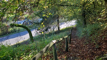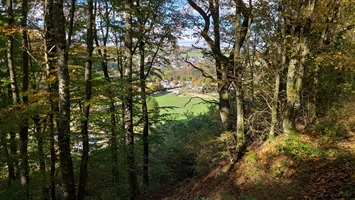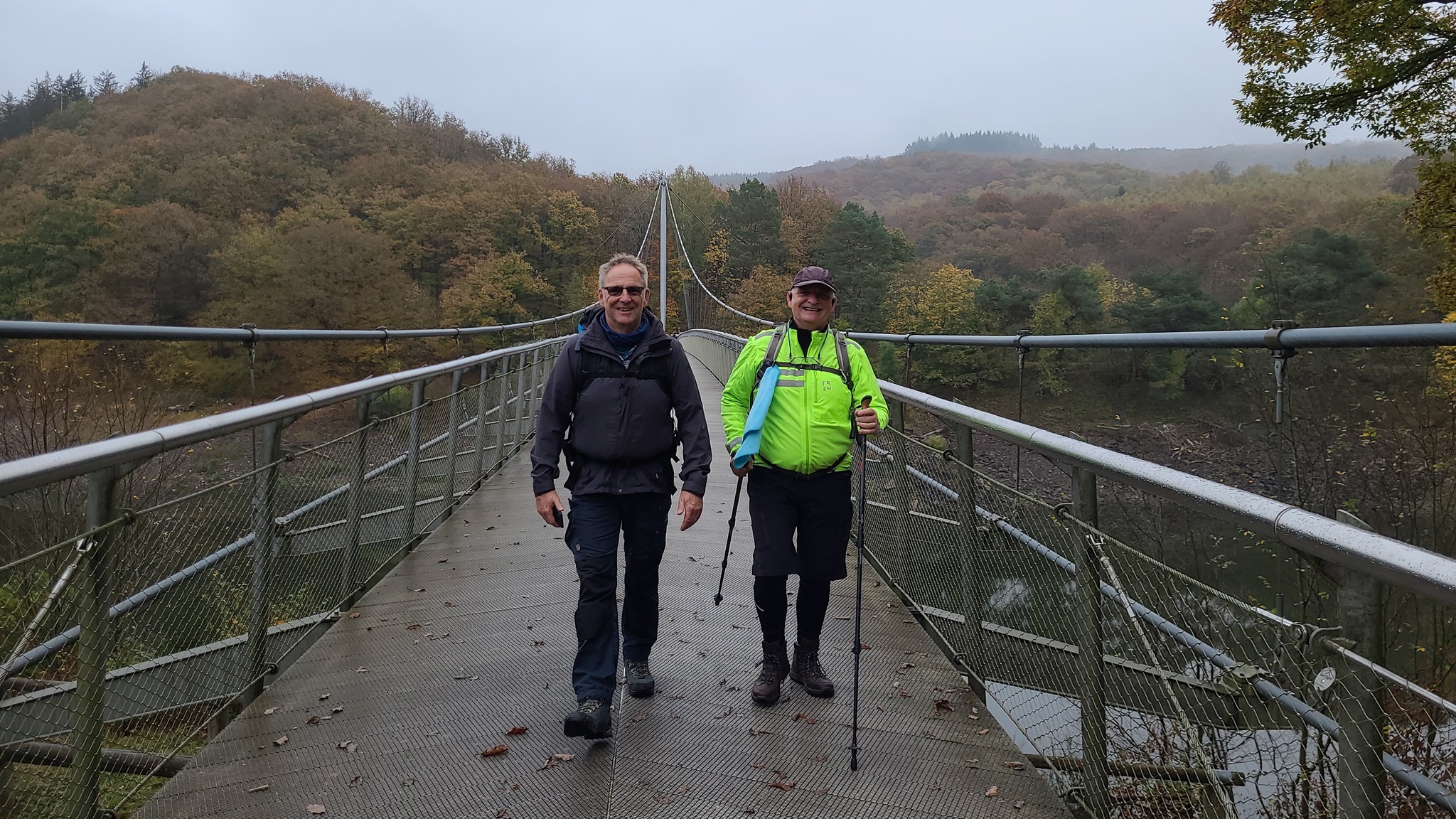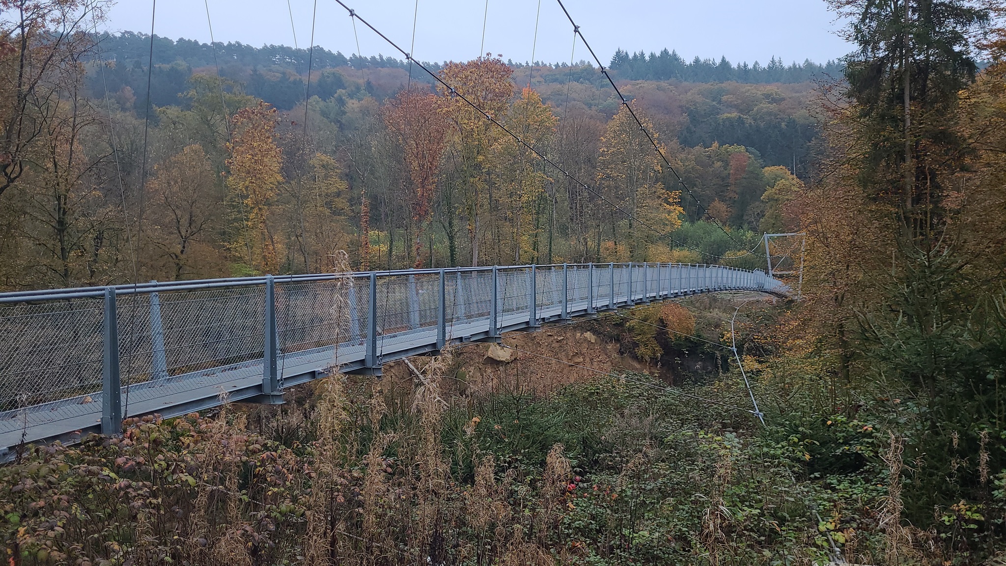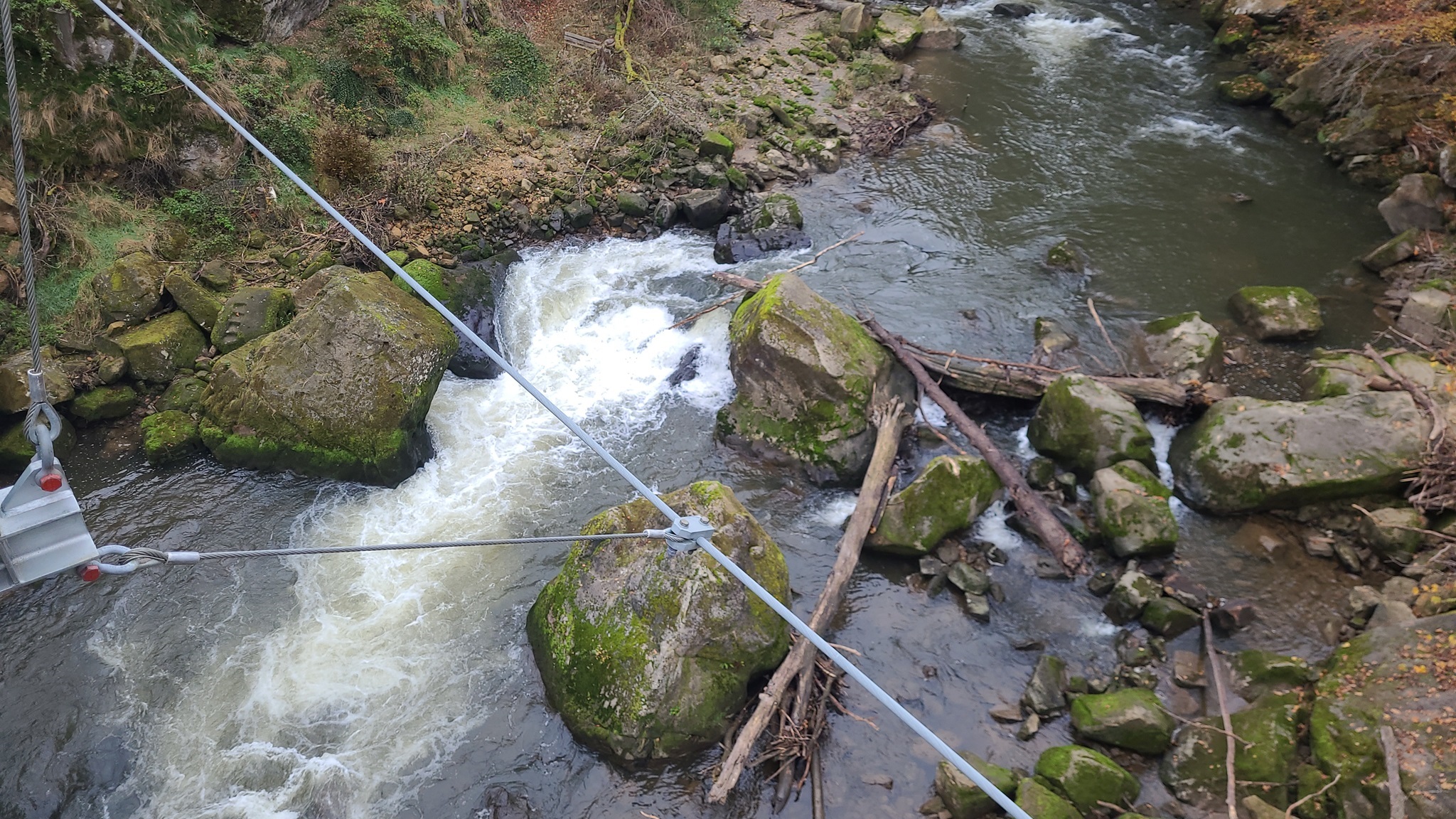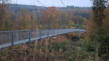 Es geht zunächst quer über das Gelände und auf der anderen Seite den steilen Weg hinunter zur Urft. Nach Überqueren der dortigen Hängebrücke geht es in einem großen Bogen durch das Kermeter-Waldgebiet, das Teil des Nationalparks Eifel ist.