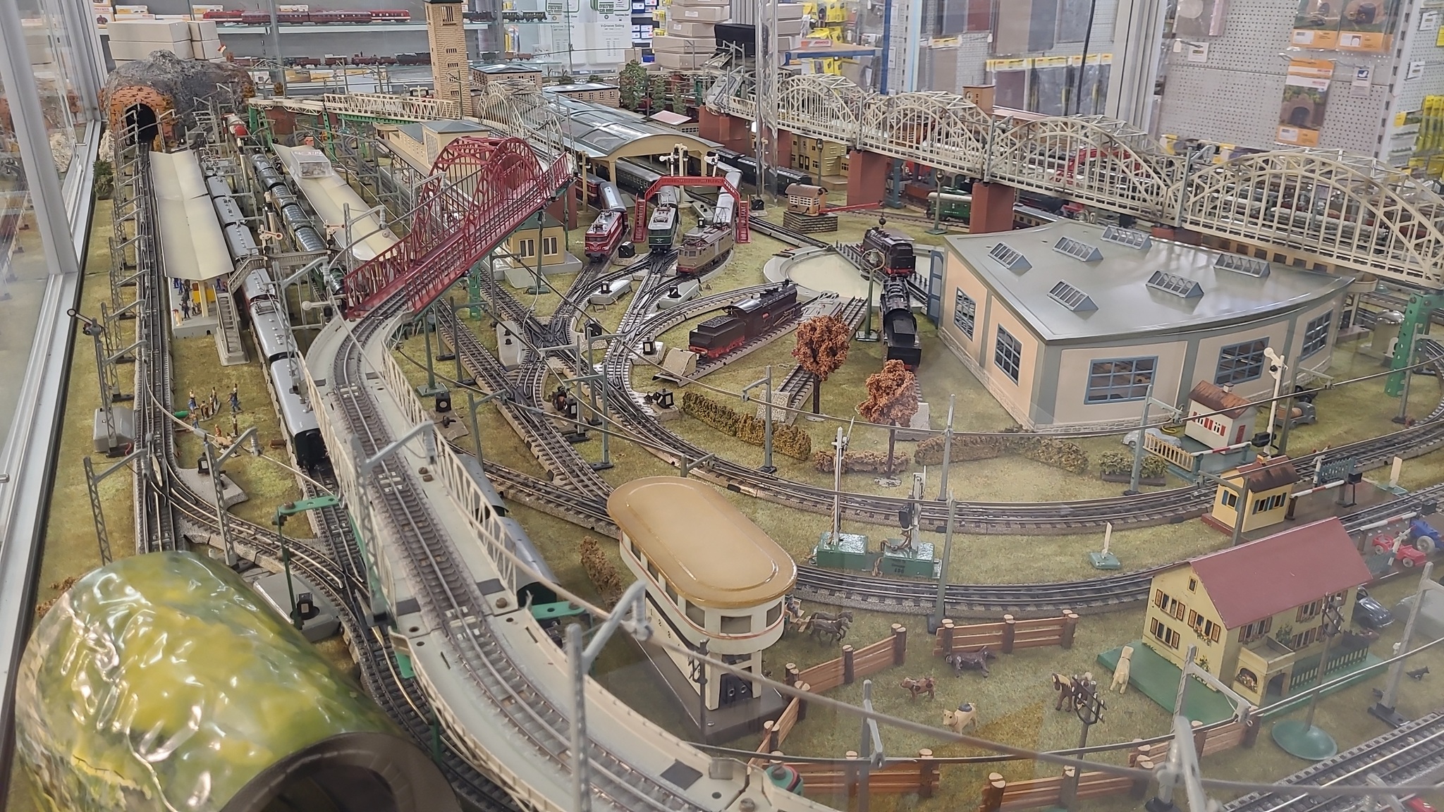 Der Laden verfügt über ein breites Sortiment und ich schaue mir alles genau an. Außerdem gibt es eine Märklin-Bahn, die mit historischem Material im Stile der frühen Modellbahn-Jahre erbaut wurde und die im Laden ausgestellt ist. So vergeht die Zeit.