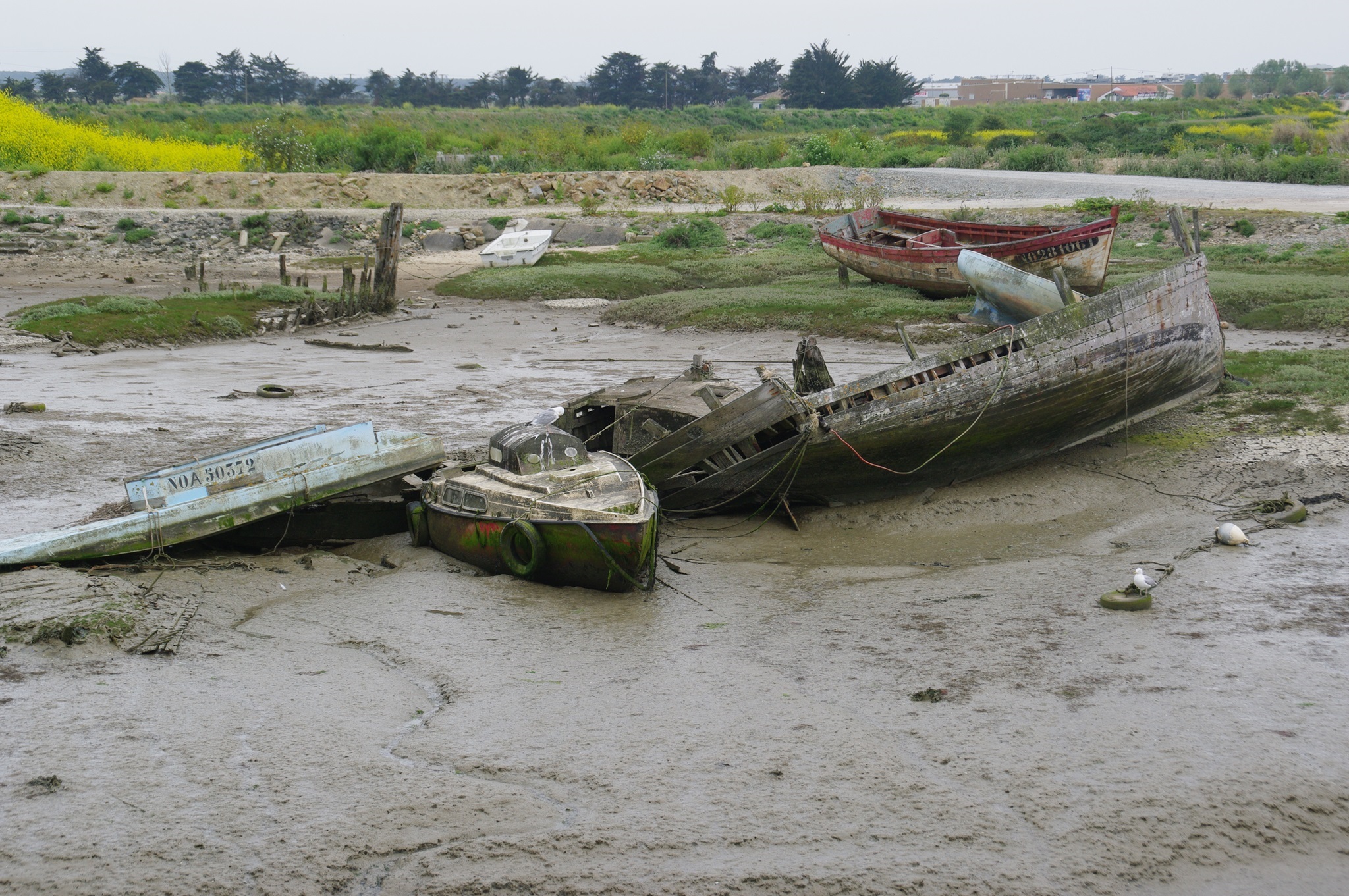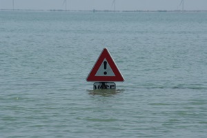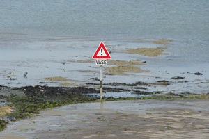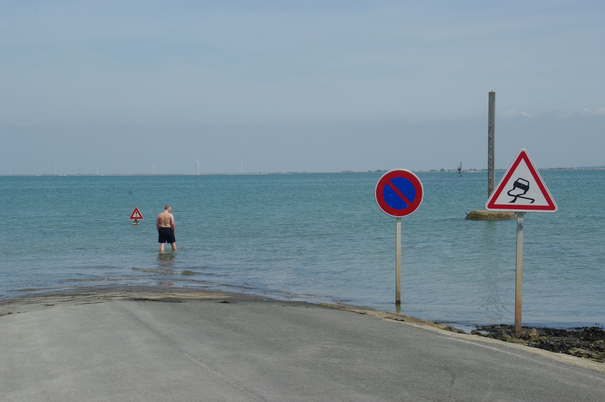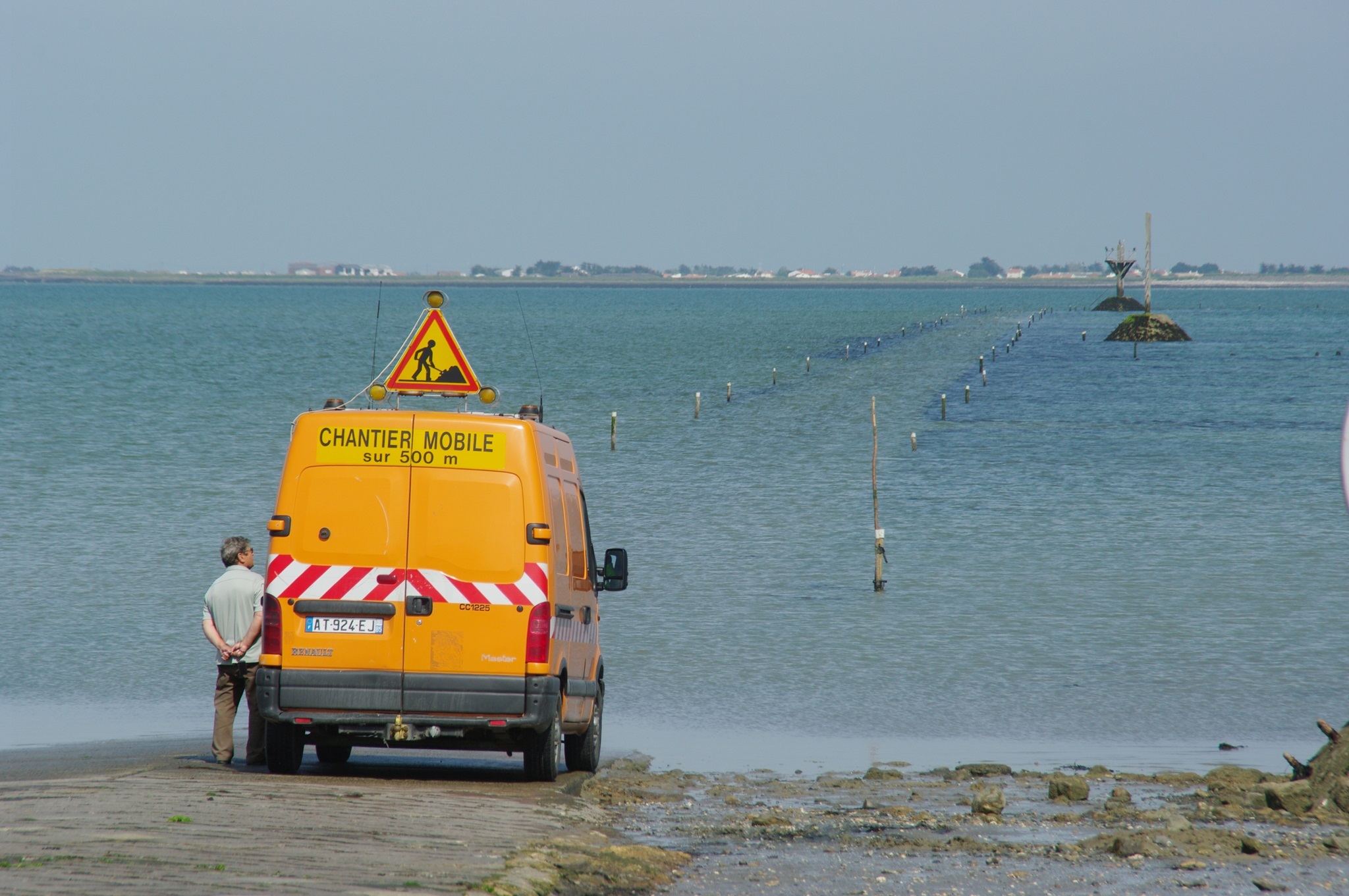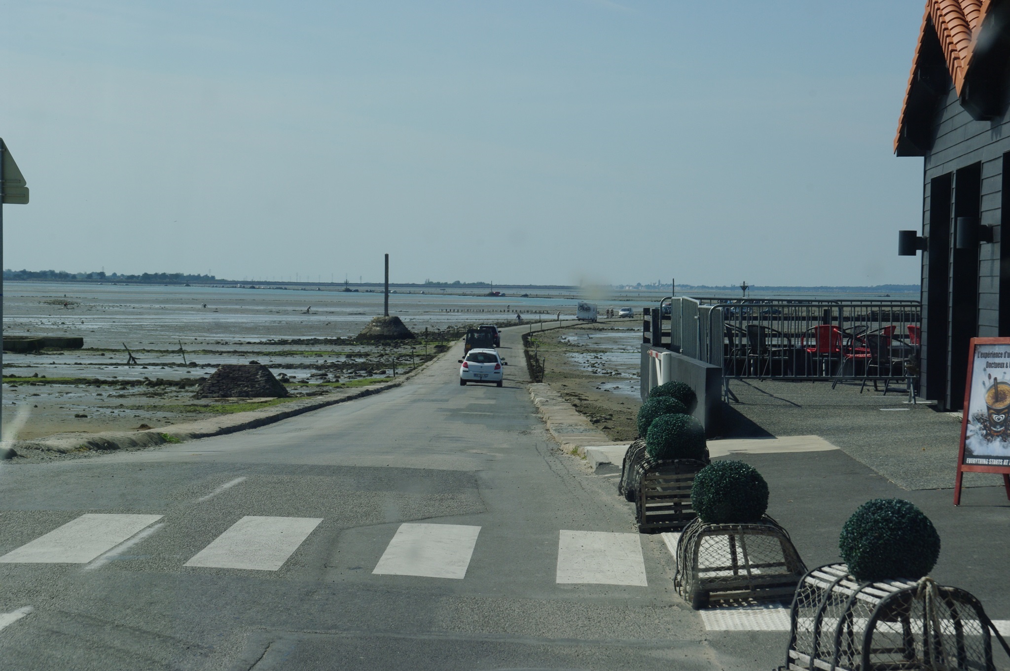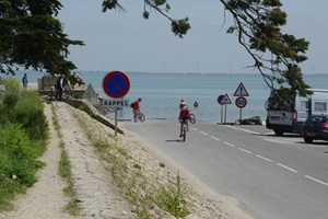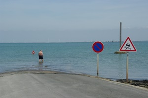 Wir rollen zum Ausgang der Insel (ist wirklich so beschildert: Sortie de l’Ile). Bei der Passage du Gois biegen wir nochmal ab. Nachdem wir vorgestern bei Ebbe hier durchgefahren sind, wollen wir uns die Stelle nun auch nochmal bei Hochwasser anschauen.