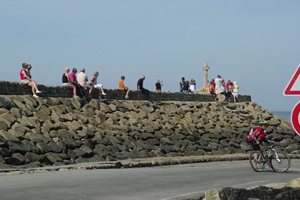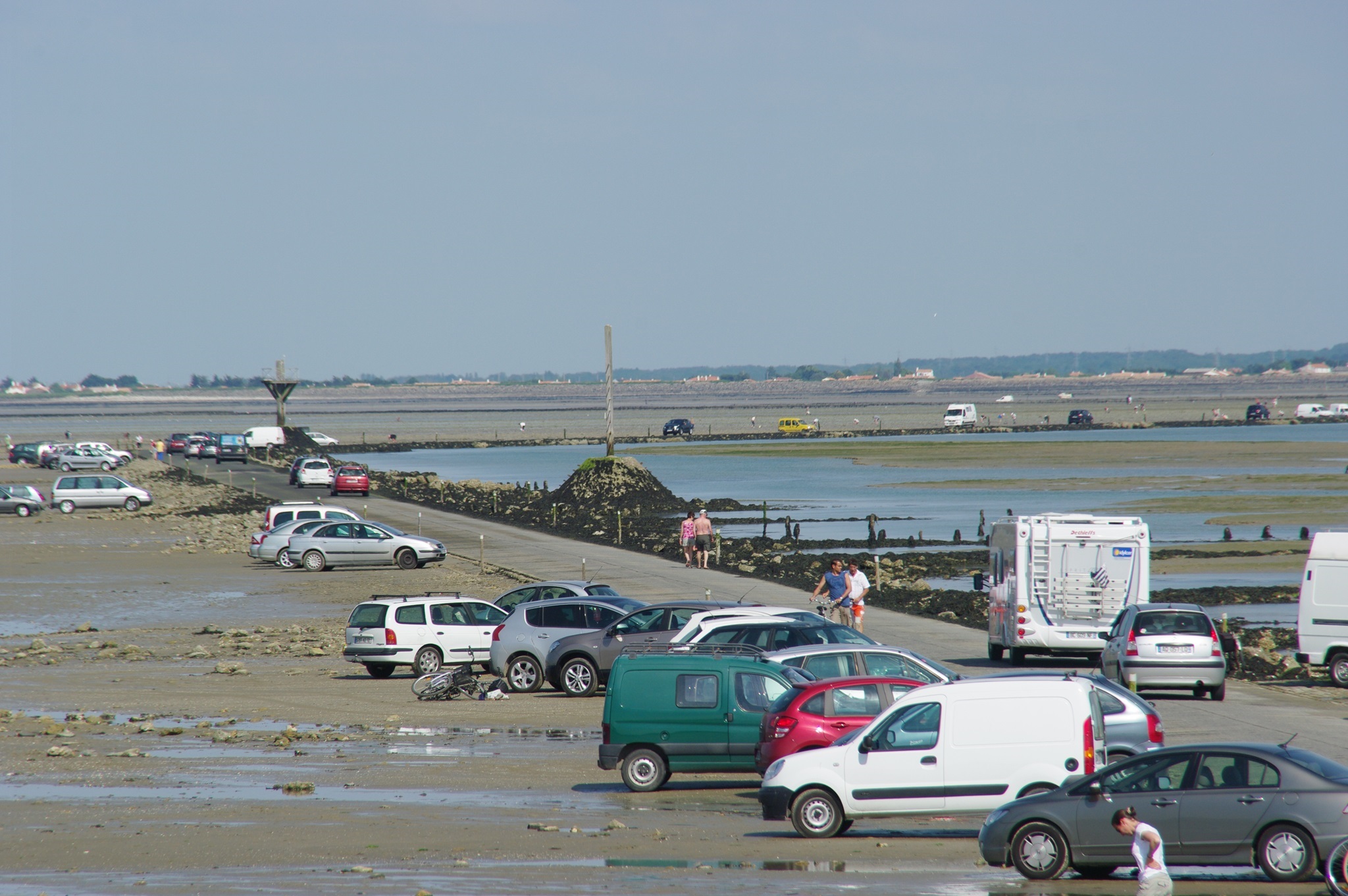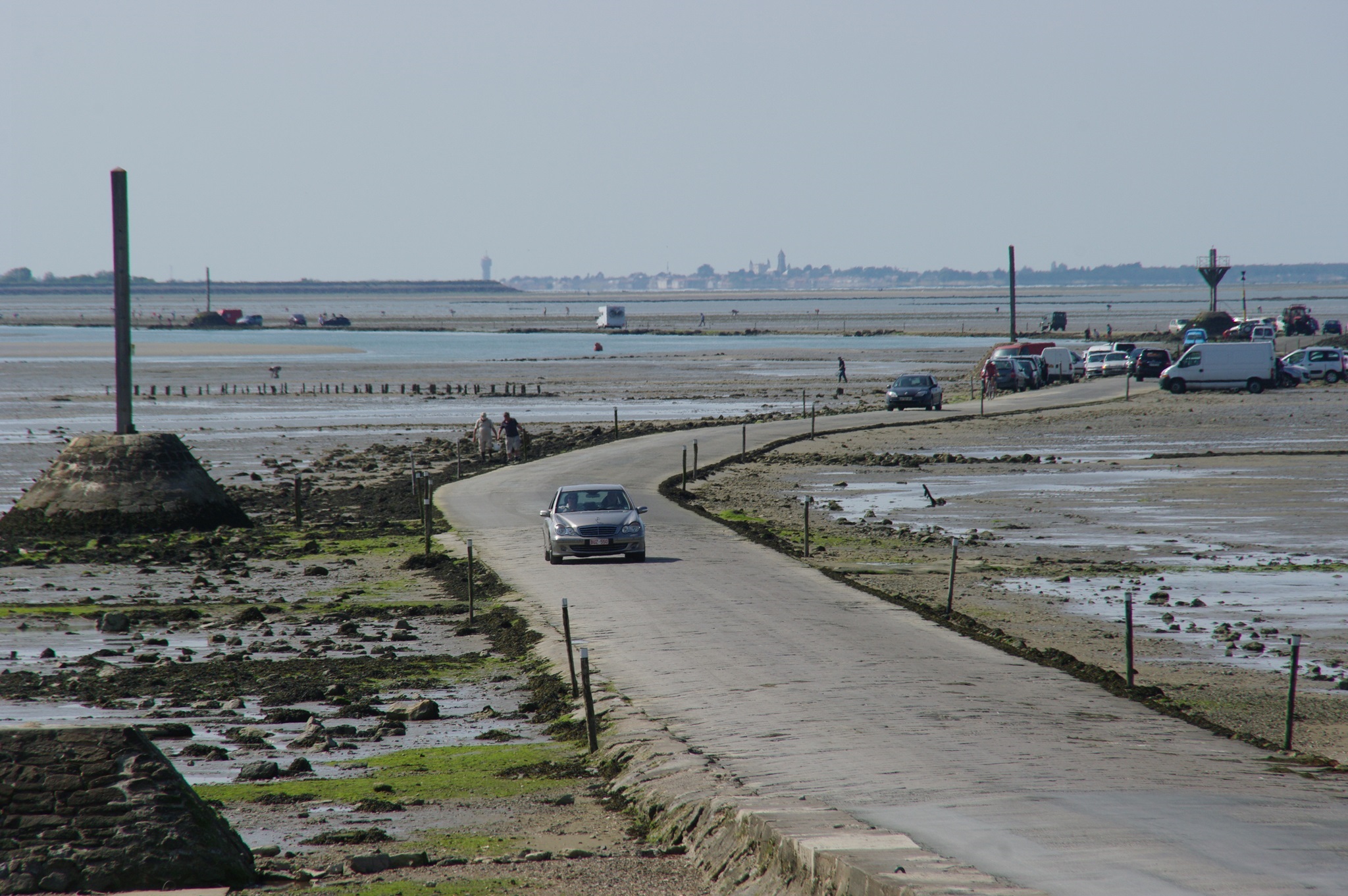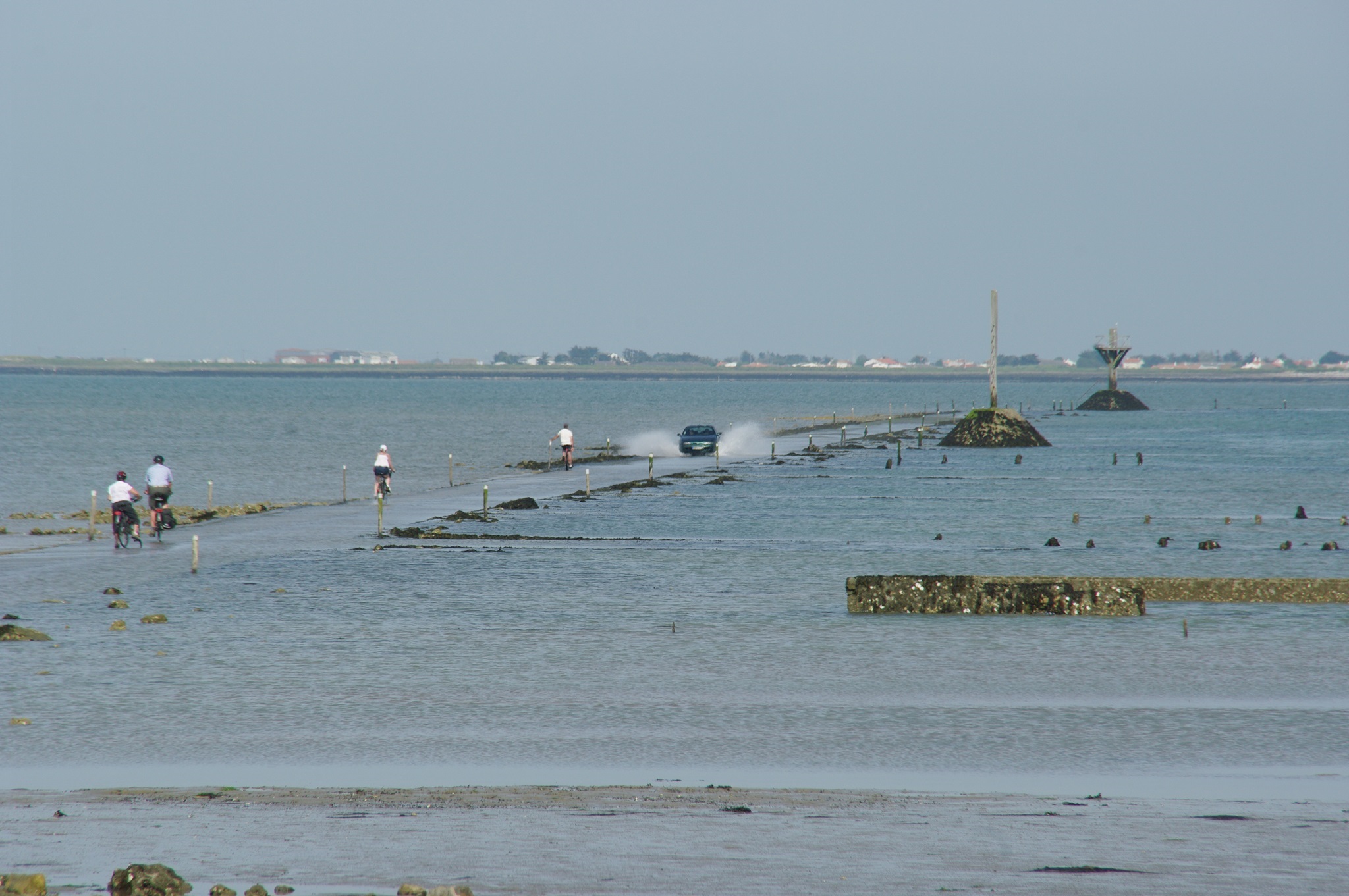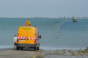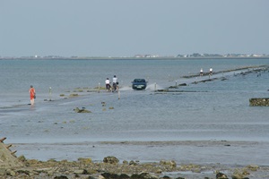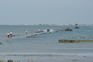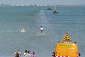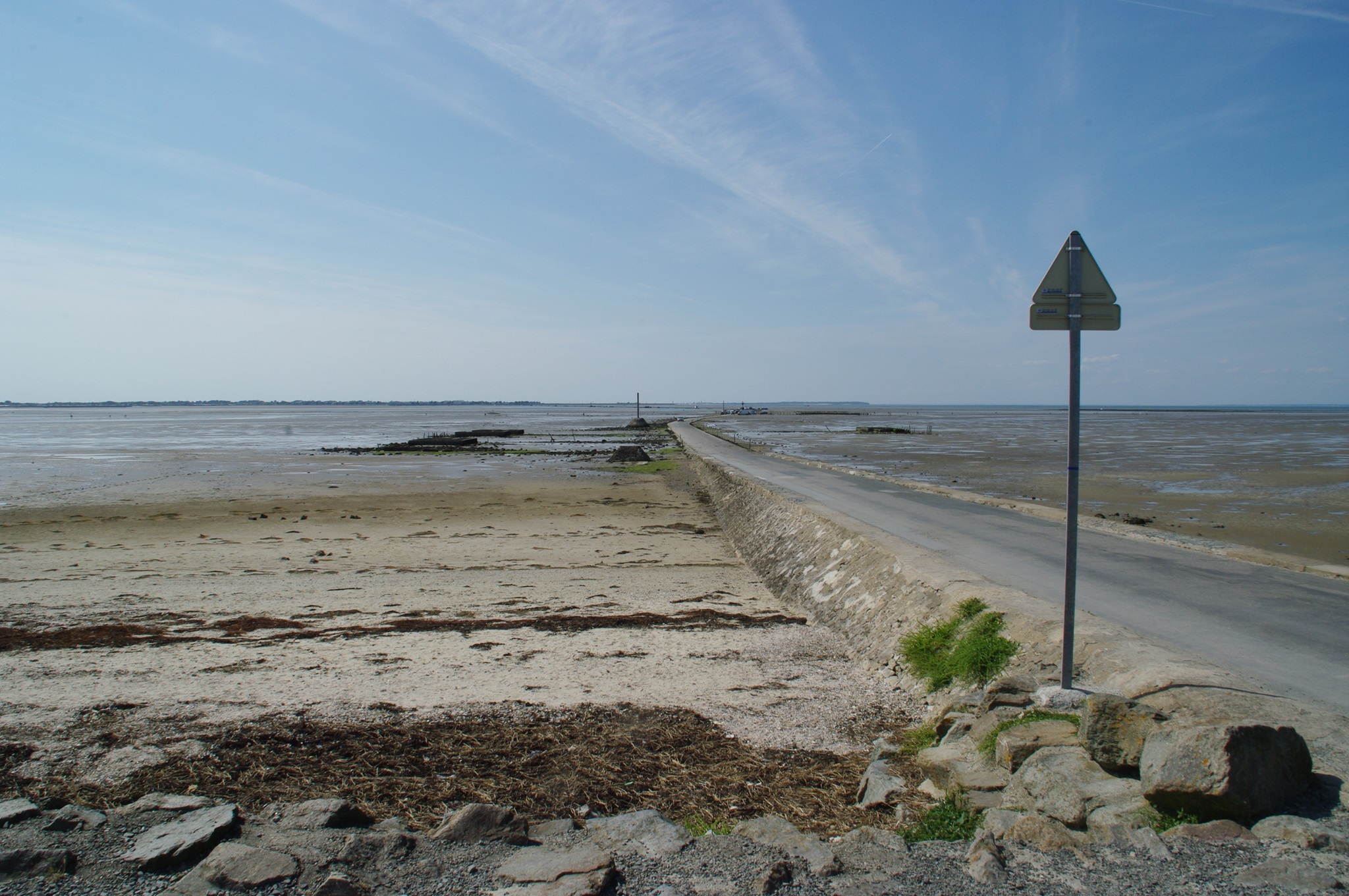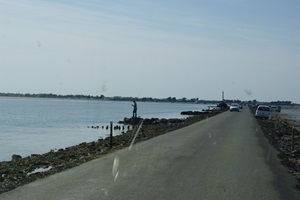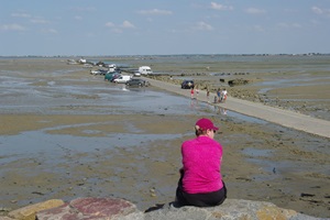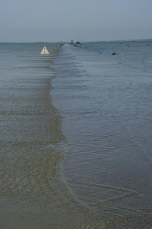 Auf dem Weg zur Insel Noirmoutier kommen wir an der Abzweigung der Passage du Gois vorbei. Zufällig haben wir gerade Niedrigwasser, so dass man die Passage befahren kann. Wir drehen und biegen ab. So eine bekannte Route kann man sich doch nicht entgehen lassen! In den letzten Jahren hatte ich eine Etappe der Tour de France verfolgt, bei der das Rennen auch die Strecke genommen hatte. Einige Rennfahrer waren auf dem etwas glitschigen Untergrund gestürzt.