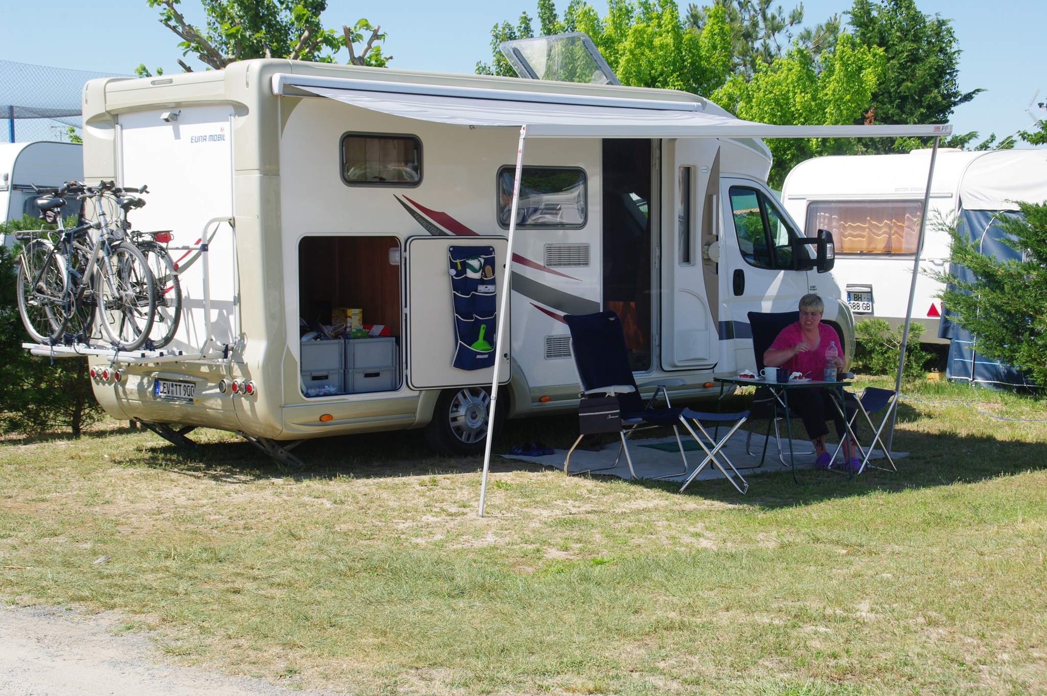 Dass wir mittlerweile schon wieder voll im Urlaubsmodus sind, merken wir heute, als wir uns nach nur zwei Tagen fragen, was für ein Tag heute eigentlich ist. Nach dem Frühstück wechseln wir wie geplant auf den Campingplatz, der über ein Pauschalangebot (Forfait) für Reisemobile mit zwei Personen verfügt. Wir suchen uns einen Platz halb unter Bäumen und halb in der Sonne, so dass wir uns bei Bedarf sowohl schattig wie auch sonnig nach draußen setzen können. Prima ist auch, dass es hier ein WLan-Netz inklusive gibt.