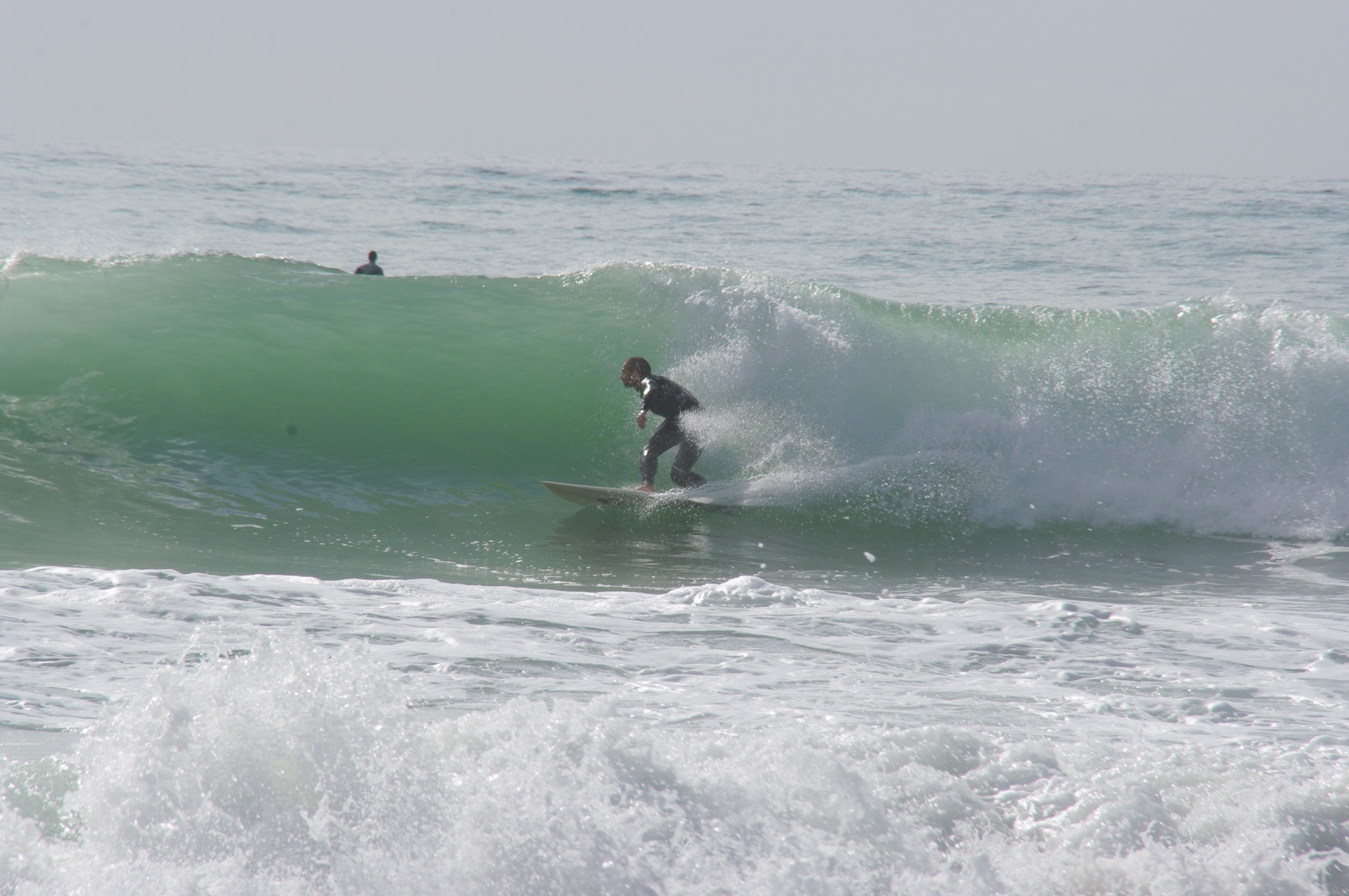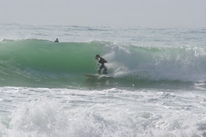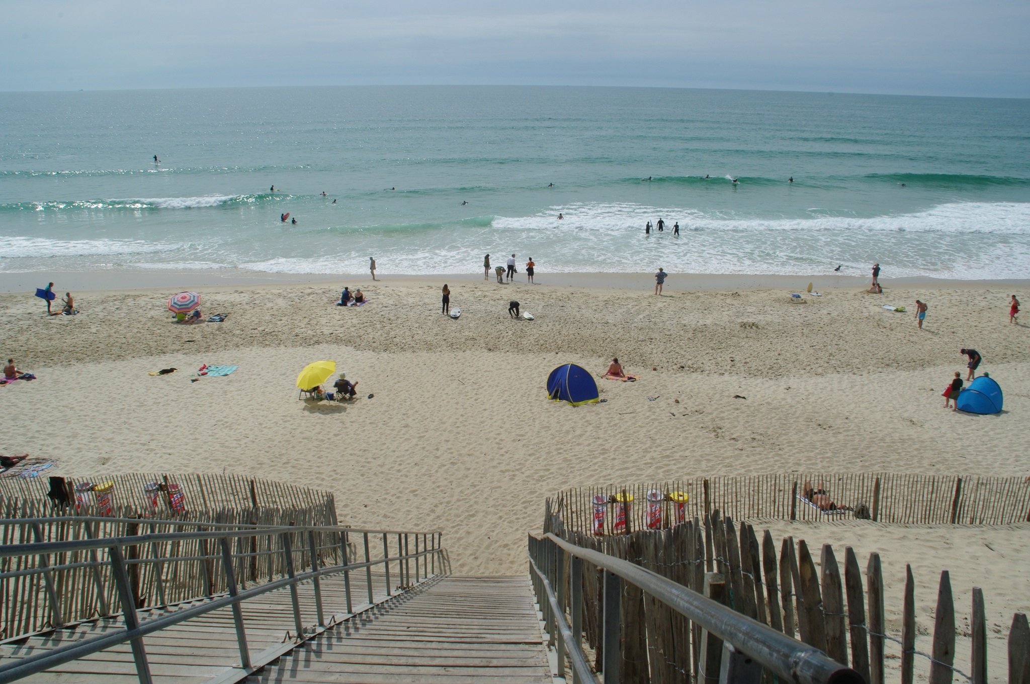 Am Strand stellen wir fest, dass die Küste hier wirklich ganz anders aussieht, als das, was wir die letzten Tage gesehen haben. Es ist felsig bis ins Meer mit Strandabschnitten zwischen den Felsriegeln. Und die Wellen sind hier tatsächlich nochmal ein ganzes Stück höher als gestern in Mimizan. Das macht der Größenvergleich mit den Surfern deutlich.