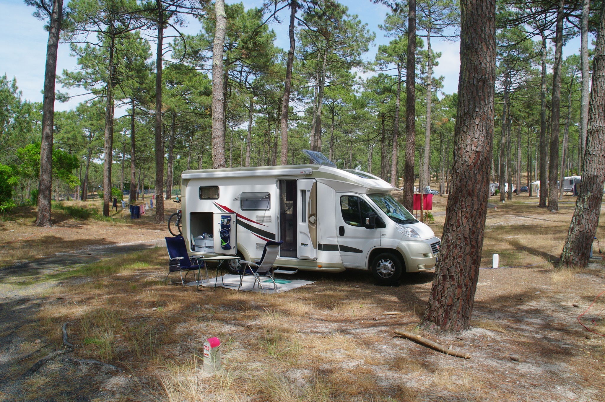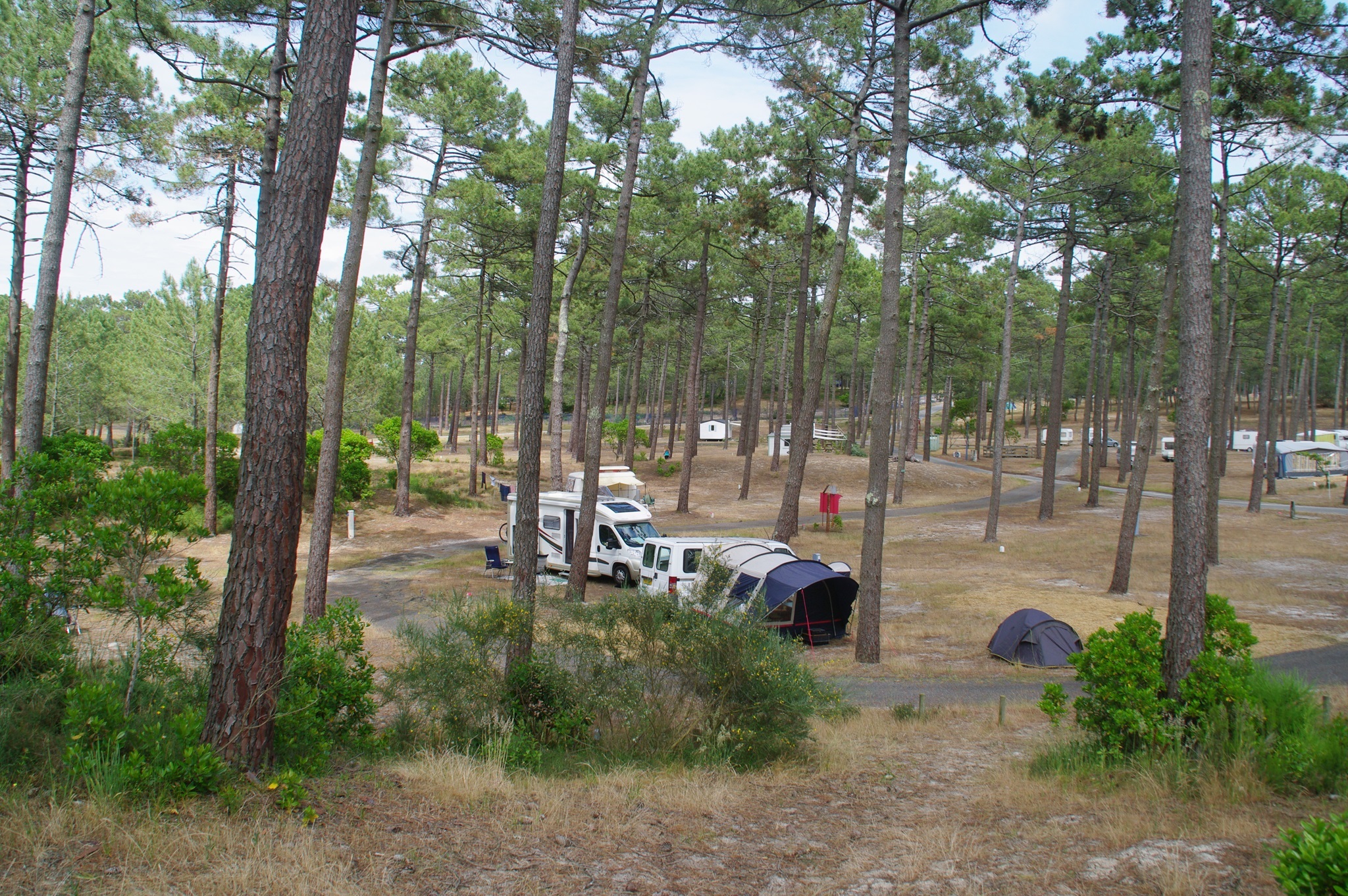 Wir nehmen quasi die erste Stichstraße zum Strand nach Hourtin-Plage. Hier gibt es keinen Stellplatz, sondern nur eine 5-Sterne Campingplatz. Das „Forfait“-Angebot für ein Reisemobil kostet hier in der Nebensaison 28 Euro. Wieder zieht sich mir alles zusammen, aber auch das muss einmal in so einem Urlaub sein. Denn dafür sind wir so nah am Strand wie es hier nur geht, nämlich rund 300 m entfernt.