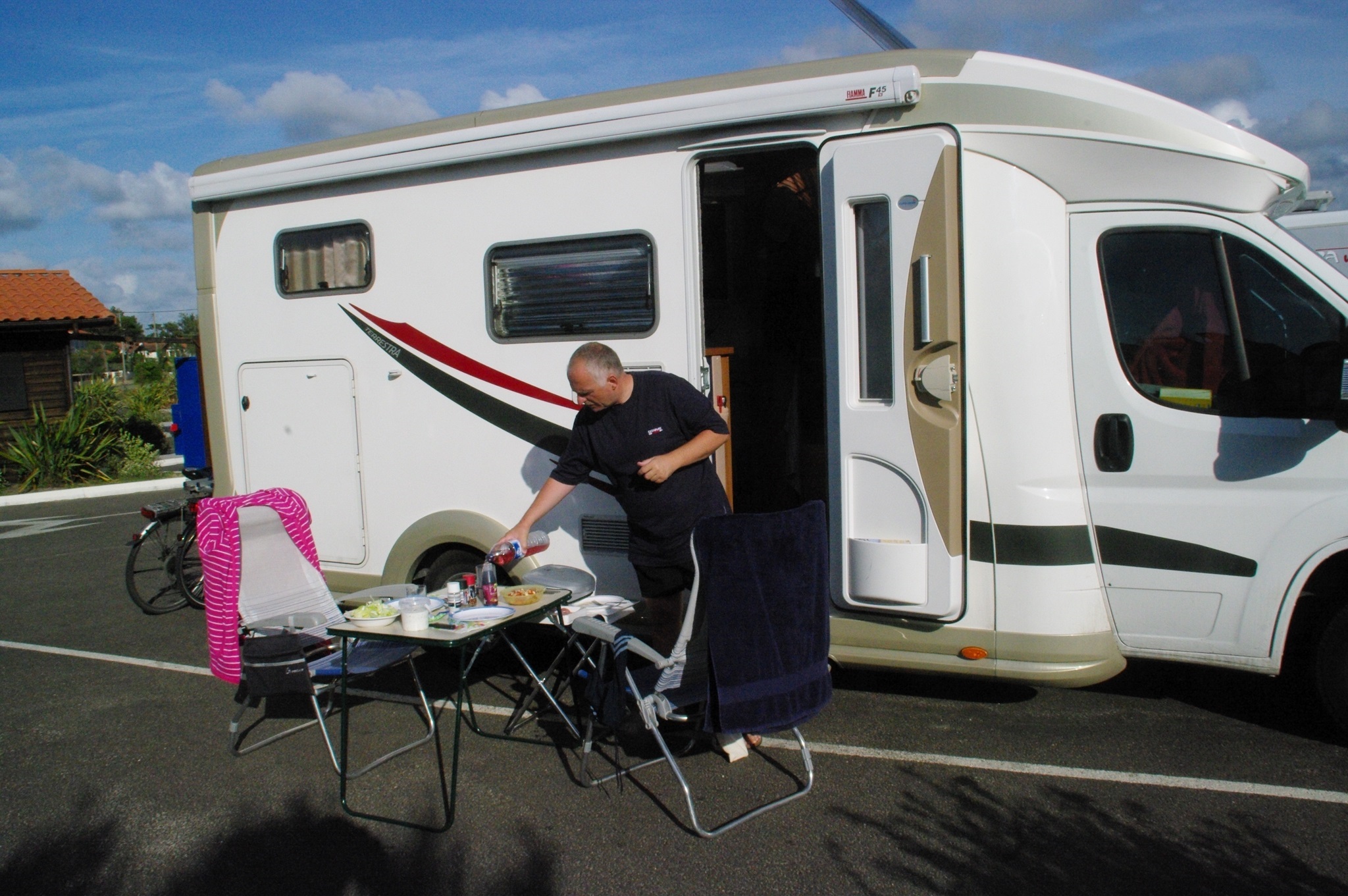 Wir starten zunächst ohne Frühstück, weil es hier auf dem Camping keine Brote zu kaufen gibt. Beim nächsten Supermarkt halten wir an und Tina geht schnell einkaufen. Dann fahren wir zum offiziellen Stellplatz des Ortes und frühstücken erst einmal.