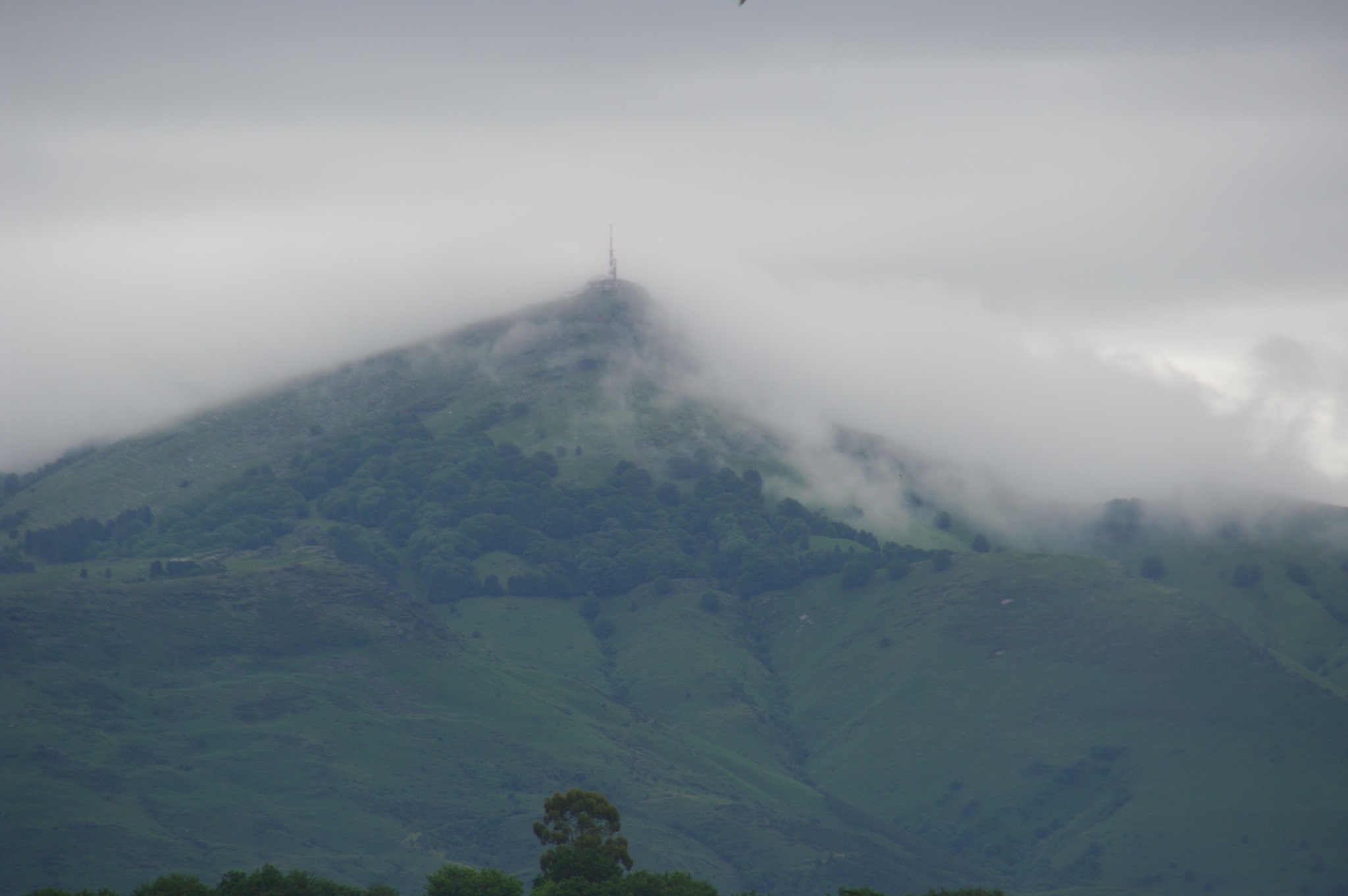 Insgesamt kommen wir mal wieder sehr spät auf den Weg. Immer wieder regnet es. Trotzdem schlagen wir erst einmal den Weg zu DEM Aussichtspunkt der Küste ein, dem 905 m hohen Berg La Rhune, der auch als der heilige Berg der Basken bezeichnet wird. Dafür muss man zunächst auf den Col de St. Ignace, der mit 169 m noch nicht so schrecklich hoch erscheint. Den Rest erledigt von dort aus dann eine Schmalspur-Zahnradbahn. Sie bringt die Touristen in kurzer Zeit die restliche Höhe bis zu der Gipfelstation von La Rhune.