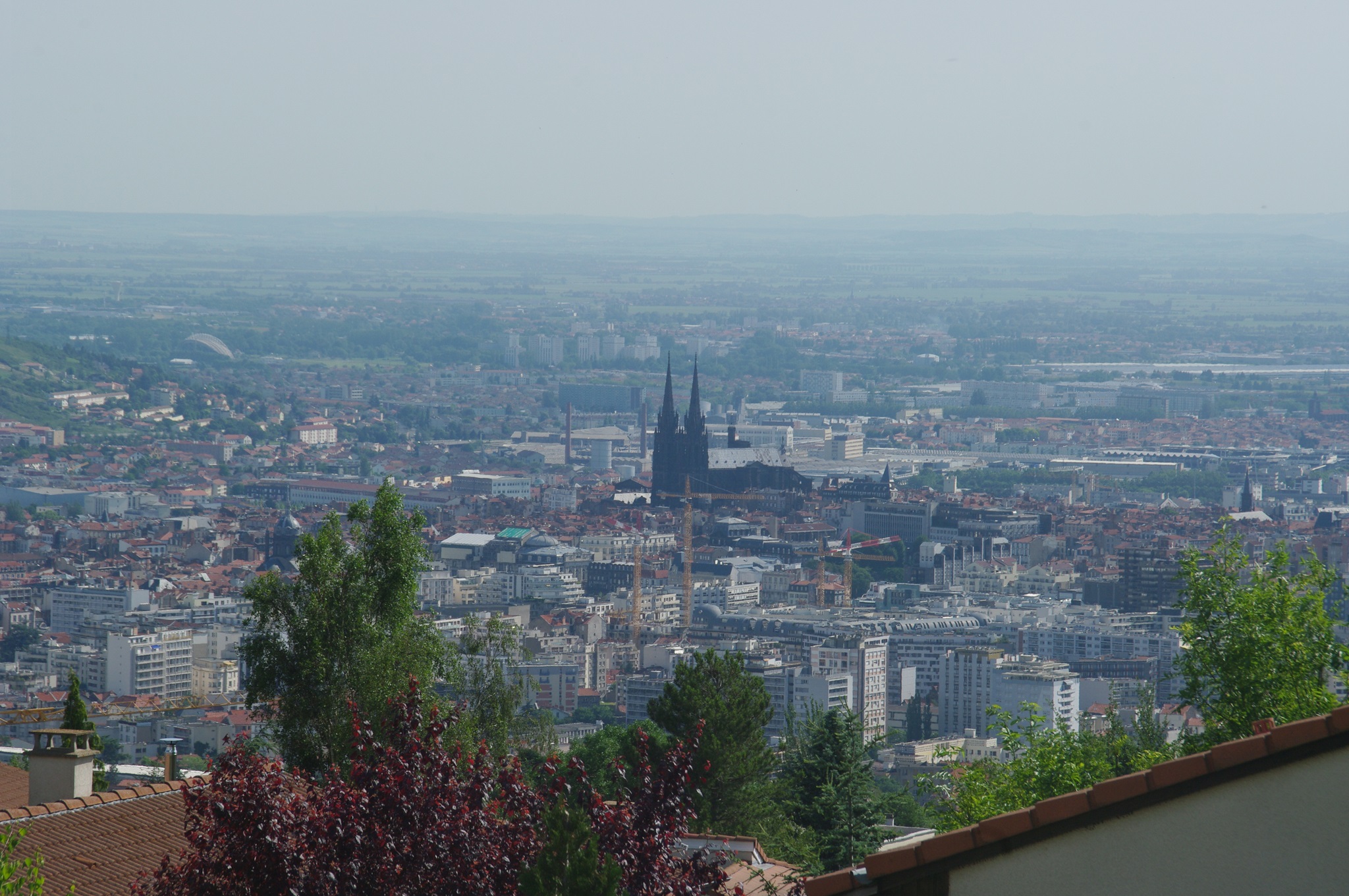 Da Royat in den Bergen unmittelbar westlich von Clermont Ferrand liegt, haben wir bei der Fahrt hinab ins Tal an einigen Stellen prima Aussicht über die Stadt und das ganze Tal. Insbesondere die aus schwarzem Lavastein erbaute Kathedrale ragt unübersehbar aus dem Häusermeer heraus.