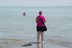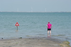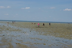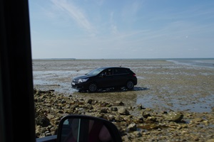 Wir fahren sehr vorsichtig, was man jedoch nicht von allen Nutzern der Passage sagen kann. Abseits der Fahrbahn stehen etliche Pkw auch direkt auf dem sandigen Meeresboden, während die Besitzer in der Umgebung auf Muschelsuche sind. Das Experiment mit dem Meeresboden wollen wir mit unserem 3,5-Tonner aber lieber nicht probieren. Auf der anderen Seite der Passage machen wir eine Pause und schauen uns eine Weile das Treiben auf dem Meeresboden an.