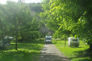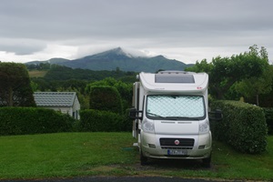 Nach der Führung fahren wir zum Campingplatz im Ort. Die Rezeption ist nicht besetzt. Man soll sich einen Platz selber aussuchen und das Geld in einem Umschlag in einen Briefkasten einwerfen. Da die Wiesen durch den Dauerregen total aufgeweicht sind, trauen wir uns nicht, mit unserem schweren Auto dort drauf zu fahren und stellen das Wohnmobil am Ende des Zufahrtweges auf dem Weg selber ab.