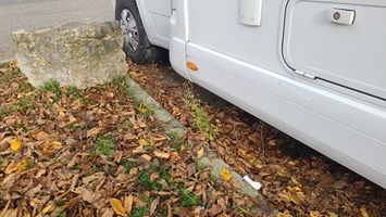 Nolwenn wartet derweil geduldig im einsetzenden Regen. Dabei hat es beim Einparken ein ziemliches Malheur gegeben, als ich einen Begrenzungsstein übersehen habe.