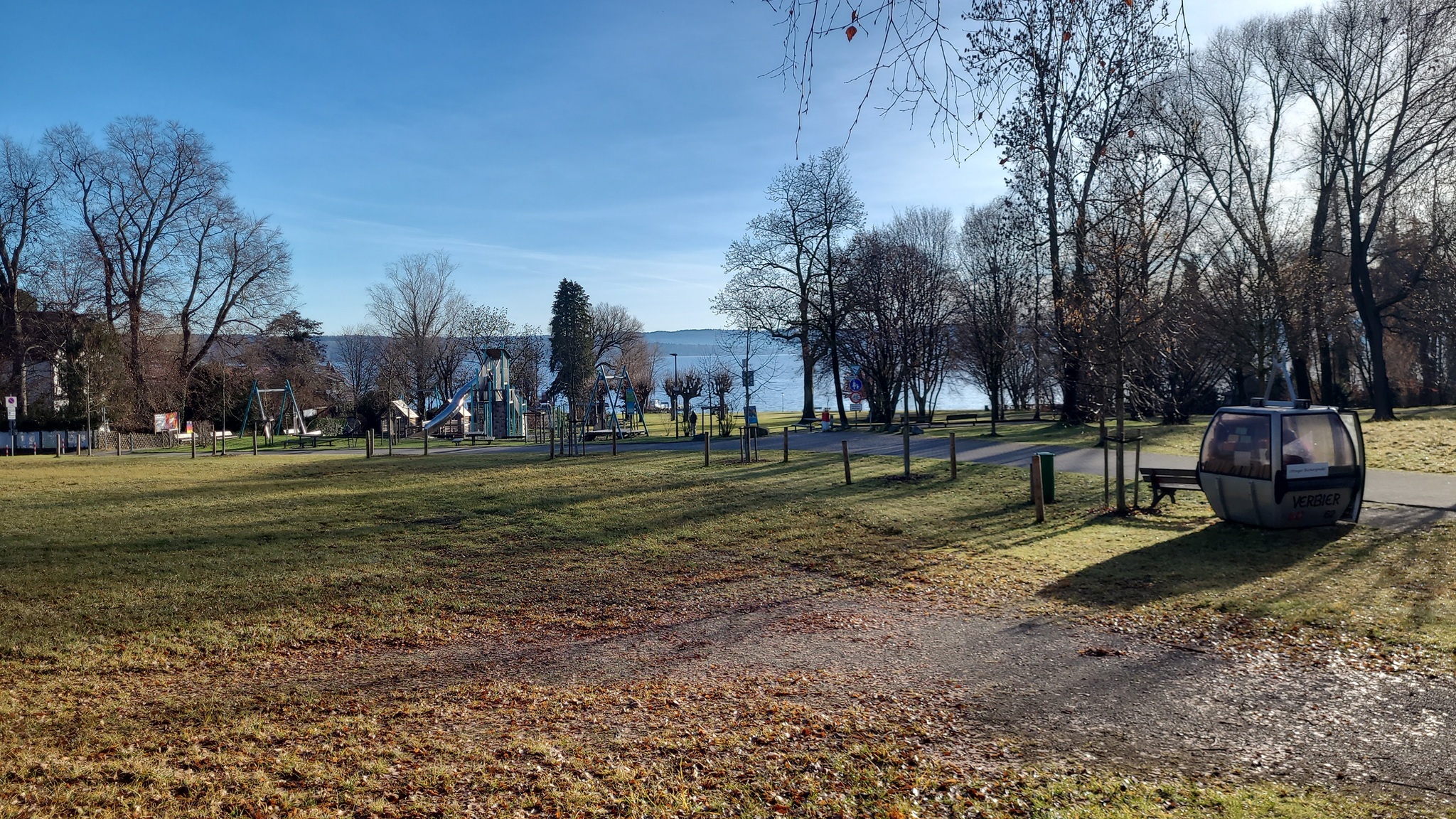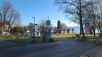 Nach dem Frühstück fahre ich nochmal die paar Kilometer zurück nach Utting. Dort möchte ich mir natürlich nochmal die Modellbahn - diesmal bei Tageslicht - anschauen. Und ich möchte mir das Seeufer bzw. den Seezugang anschauen. Es gibt auch ein Freizeitgelände am See, wo ich aber nicht hinkomme, weil die Unterführung unter der Bahnlinie nur mit 3,10 m angegeben ist. Da muss ich später also umdrehen.
