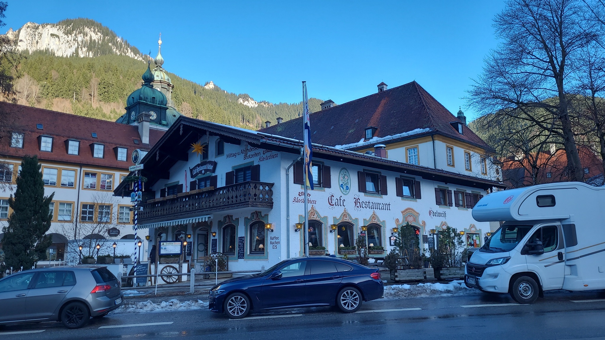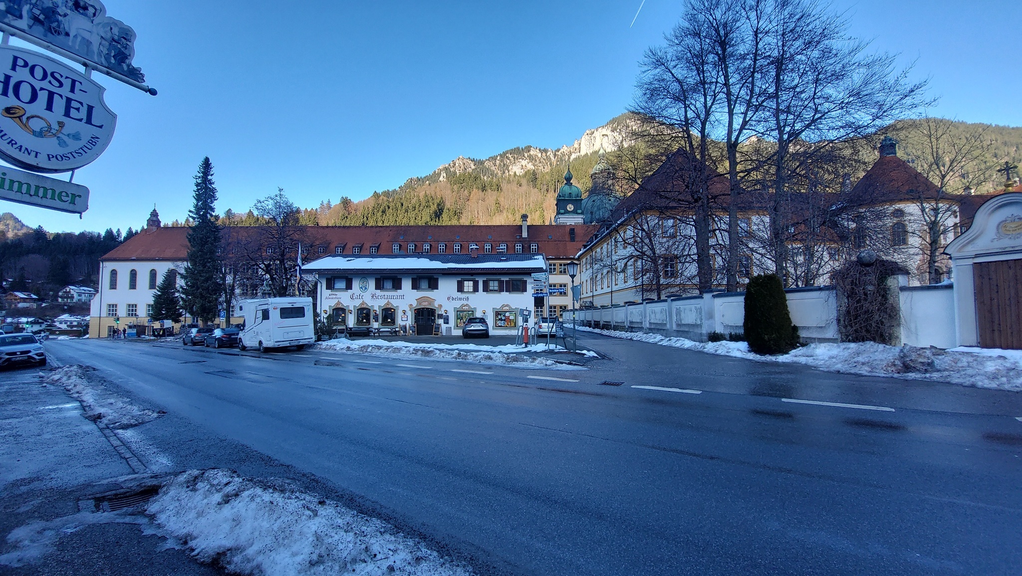 Mit dem Schnee am Straßenrand und dem klaren blauen Himmel wirkt es optisch recht kalt. Tatsächlich gibt es heute aber eine Föhn-Wetterlage und die Luft ist über 10 Grad warm.