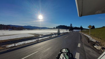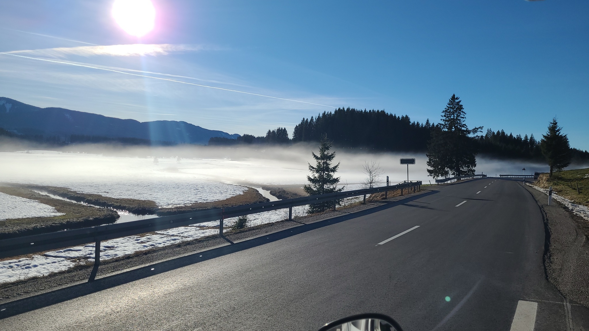 Kurz darauf gibt es neben der Straße Nebelschwaden, die sich über den schneebedeckten Hängen gebildet haben. Das sieht schon ziemlich mystisch aus.