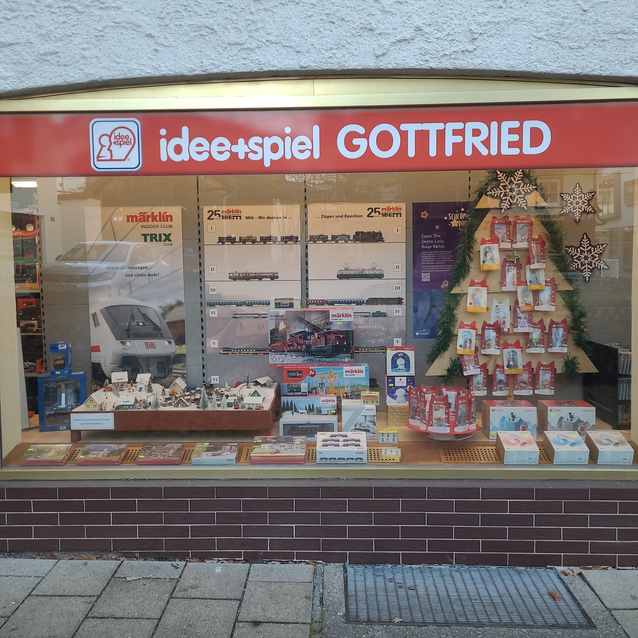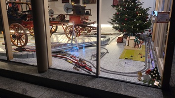 Genau dort wird seit einigen Jahren eine große Märklin-Bahn auf dem Fußboden aufgebaut. Auch hier hat sich das Ganze über die Jahre immer weiter entwickelt. Zuschauer und besonders die Kinder haben die Möglichkeit, die Anlage hinter der Schaufensterscheibe von draußen per Knopfdruck zu starten.