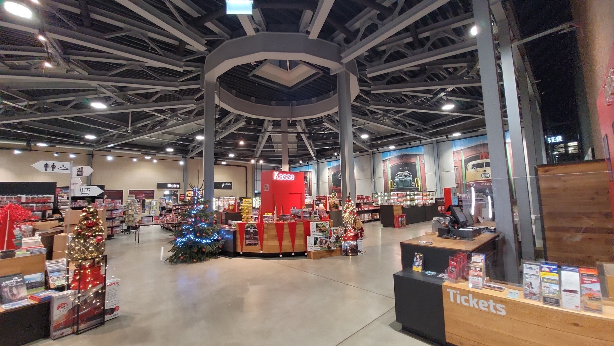 Auf den Fotos vom Inneren des heute dann geöffneten Märklineums erkennt man übrigens recht gut, dass das hier einem alten Rundlokschuppen bzw. der Drehscheibe vor einem solchen Lockschuppen nachempfunden ist.