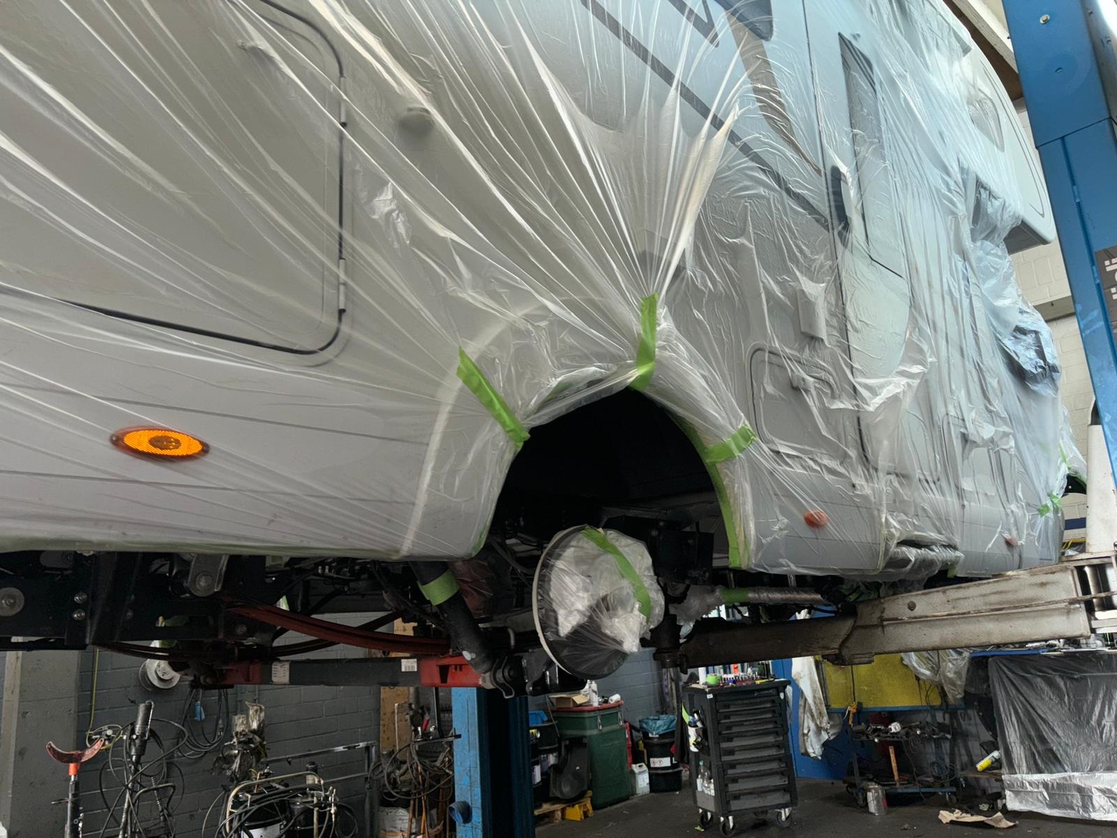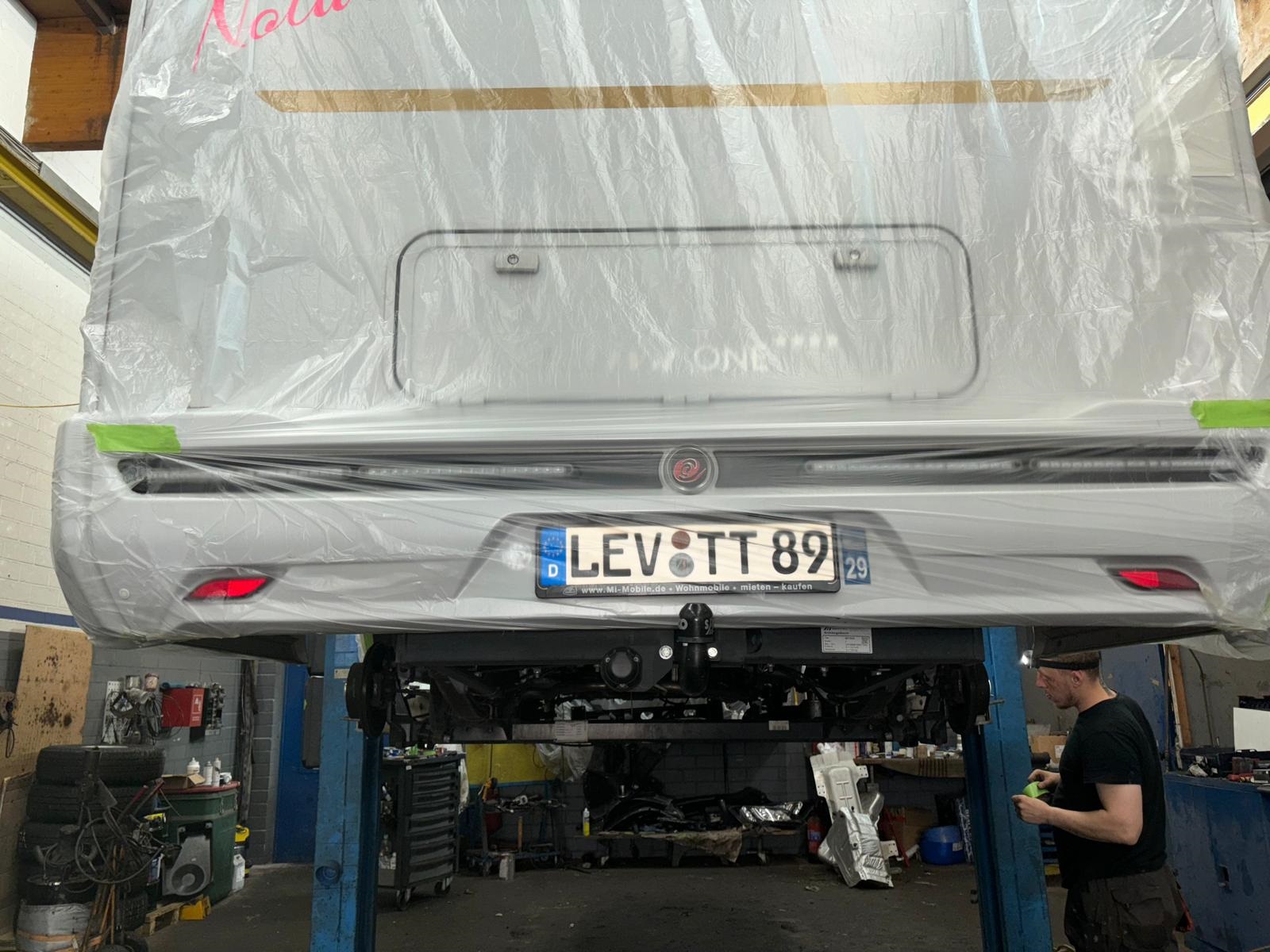 - Die Räder müssen runter, damit die Radkästen zugänglich sind. Nicht jede Hebevorrichtung kann Nolwenn ohne Räder anheben.