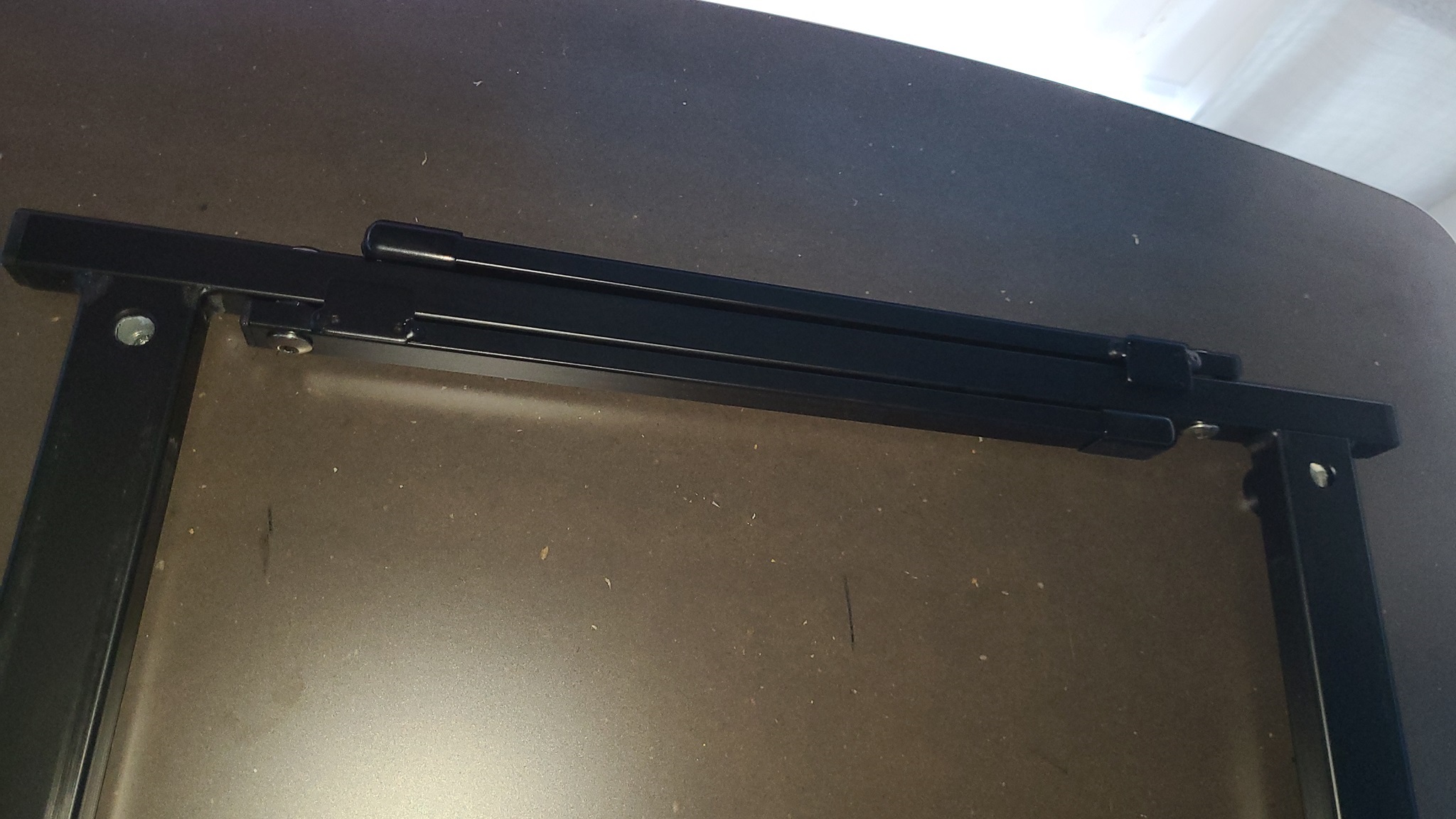Dabei sind mir vier ungewöhnliche Stahlrohre aufgefallen, die für mich so zunächst überhaupt keine Funktion hatten. Bei genauerer Betrachtung stellte sich heraus, dass es sich um vier zusätzliche Tischbeine handelt, die die Platte in der unteren Position näher an den Ecken abstützen sollen.