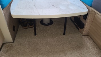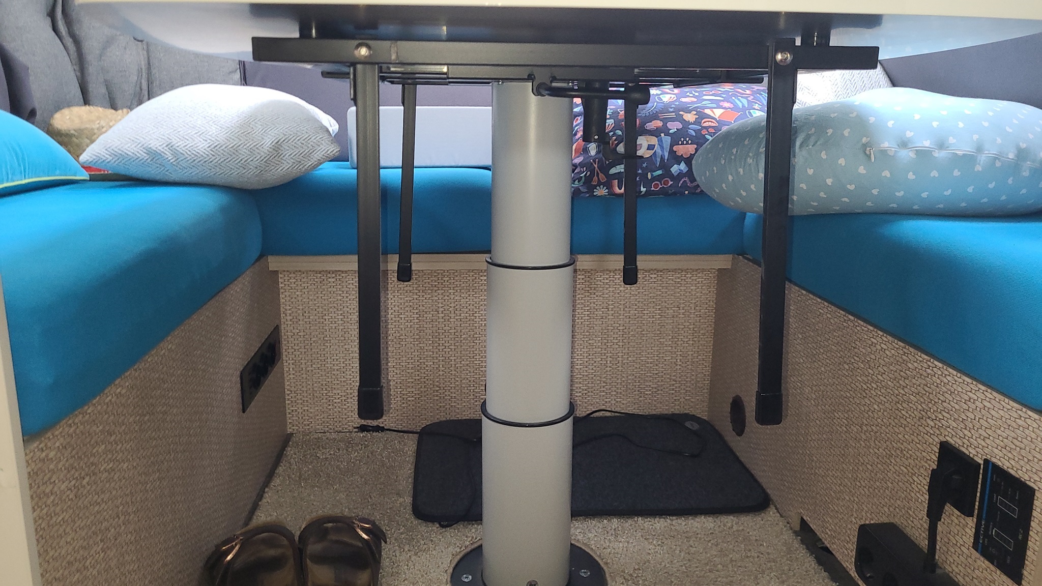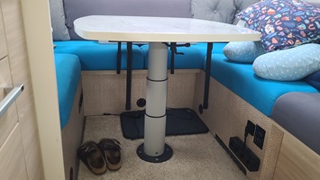 Nolwenn hat in der Hecksitzgruppe einen Tisch, der sich absenken lässt, um die Sitzgruppe in eine Liegefläche zu verwandeln. Das ist nichts Besonderes und allgemein bekannt. Ebenso wie die Tatsache, dass sich die Tischplatte in "X/Y"-Richtung verschieben lässt.
